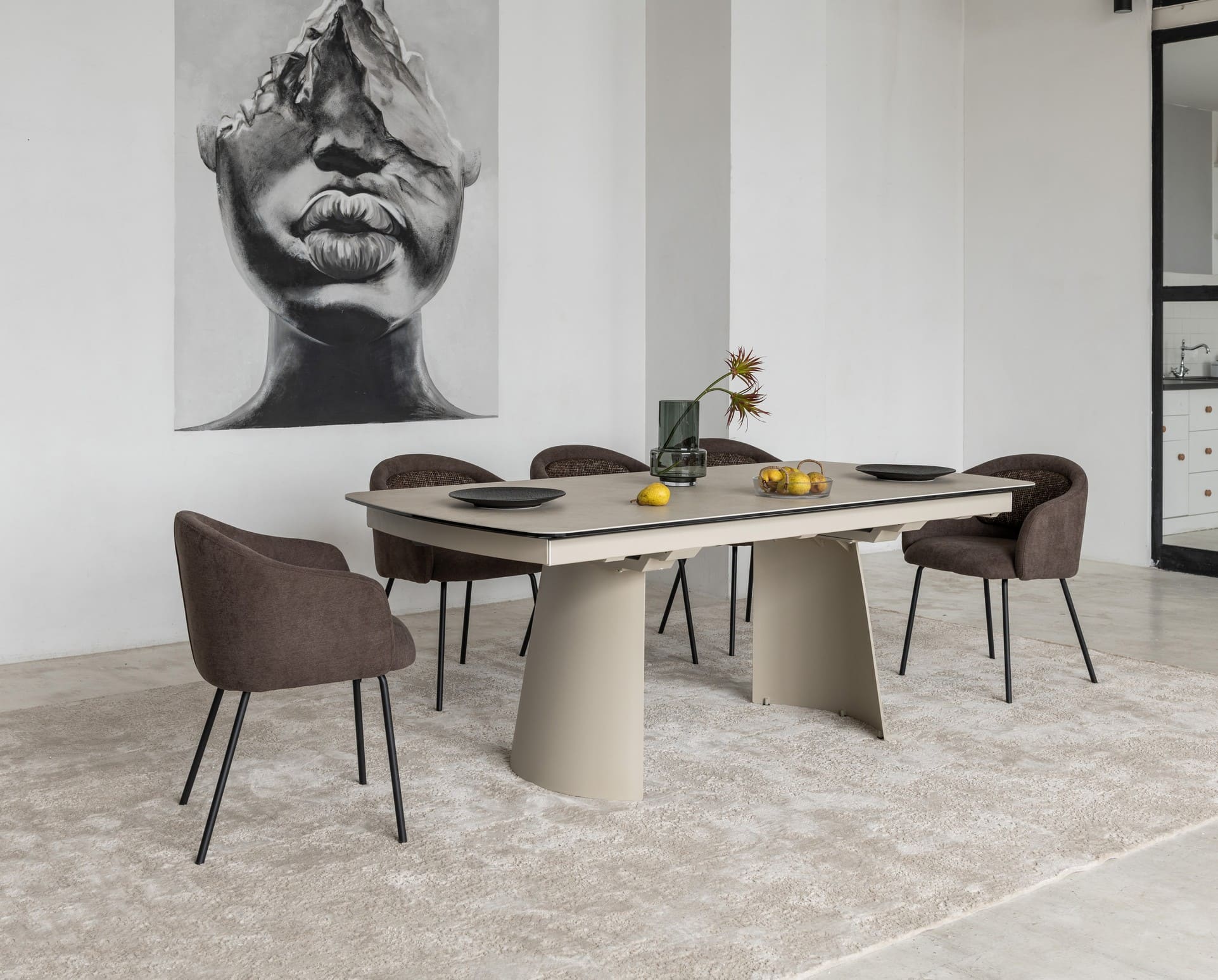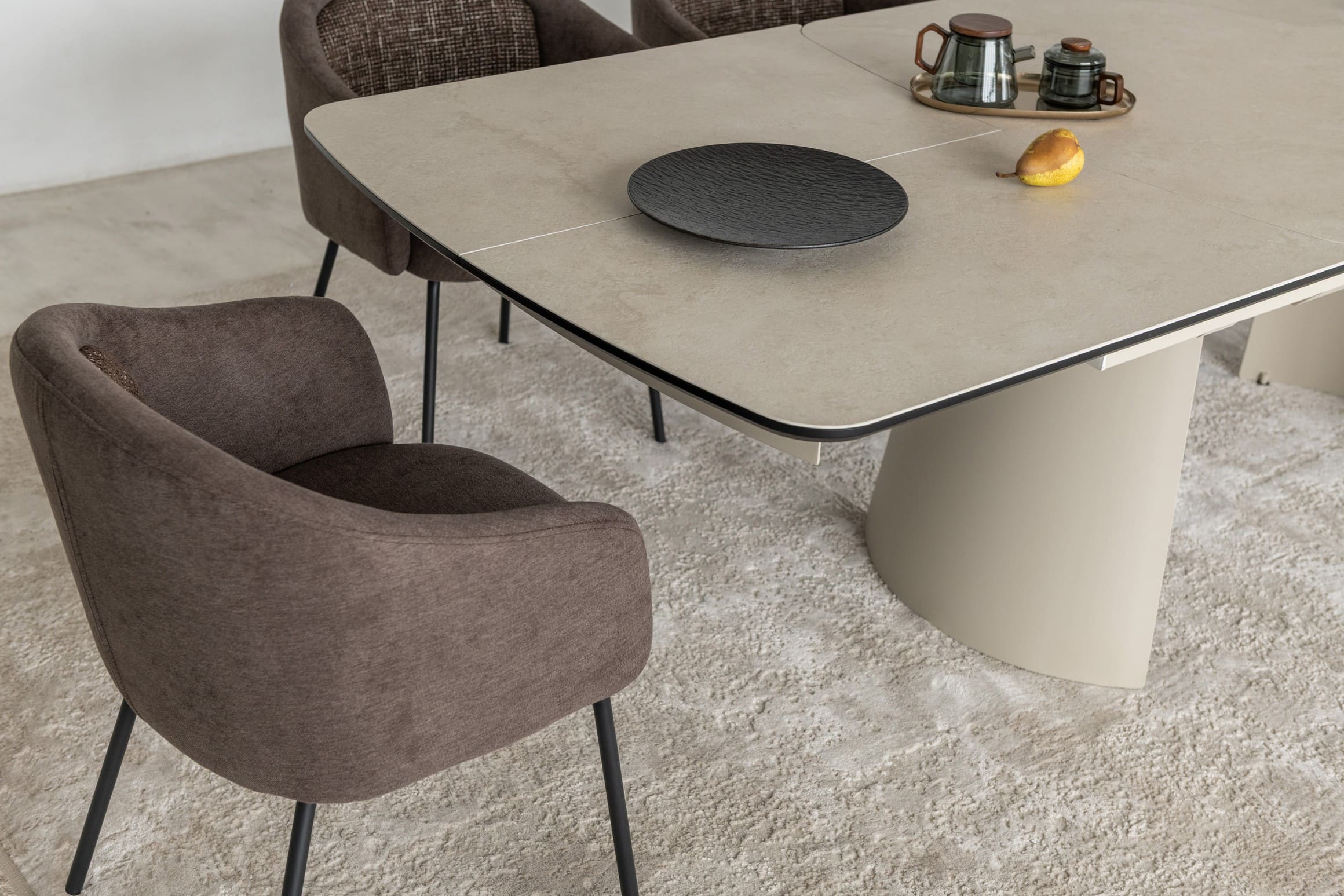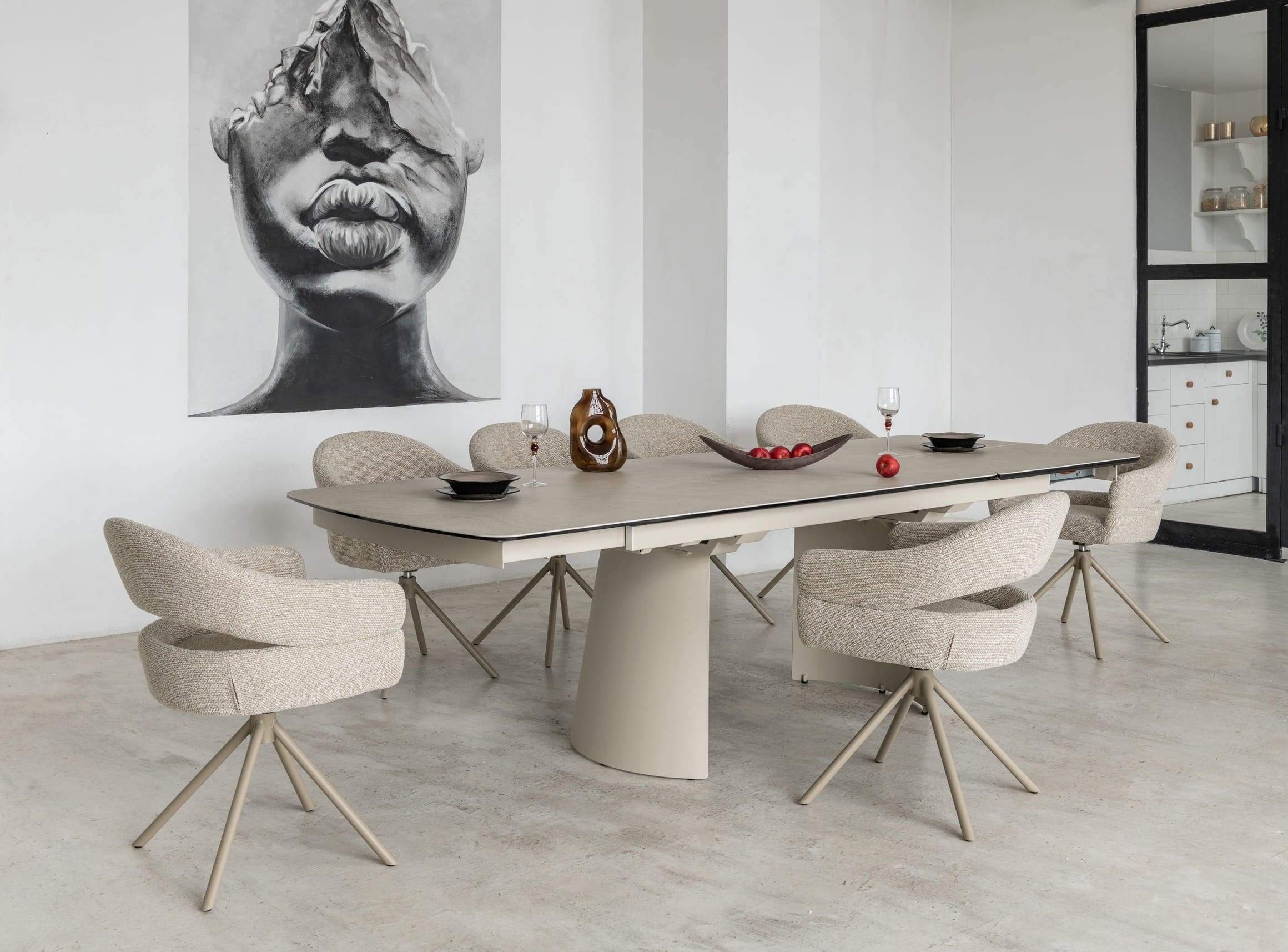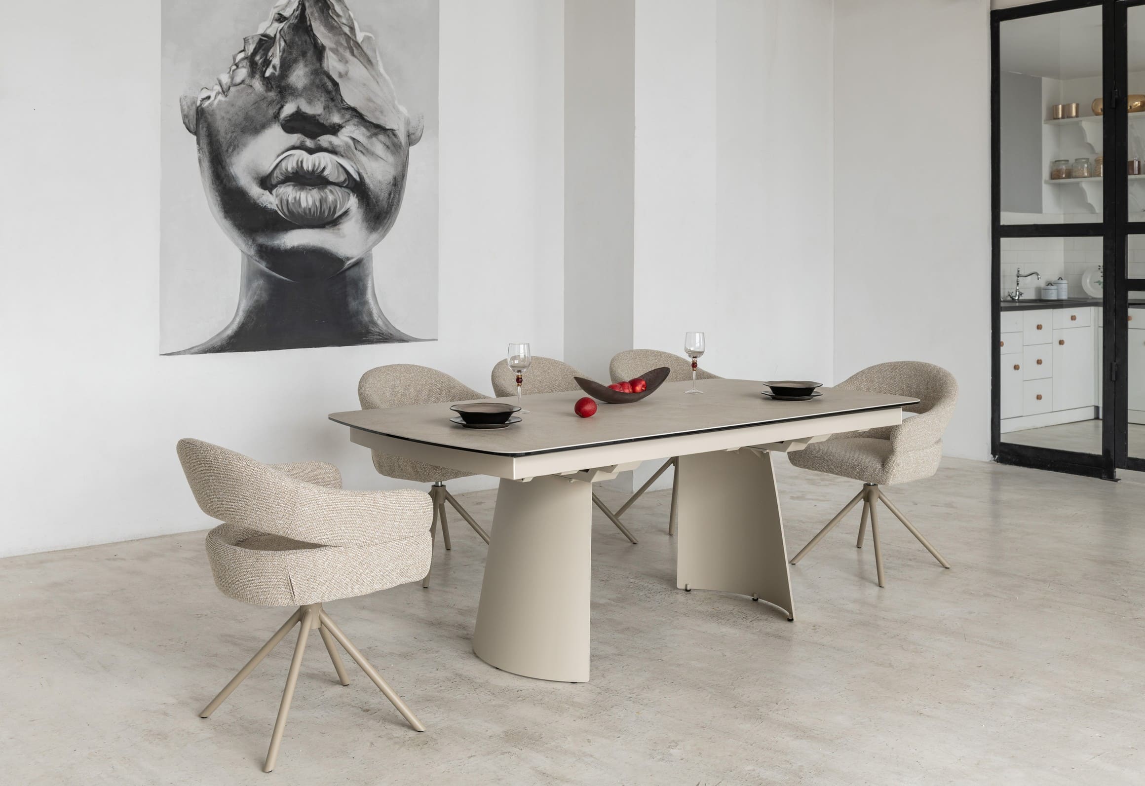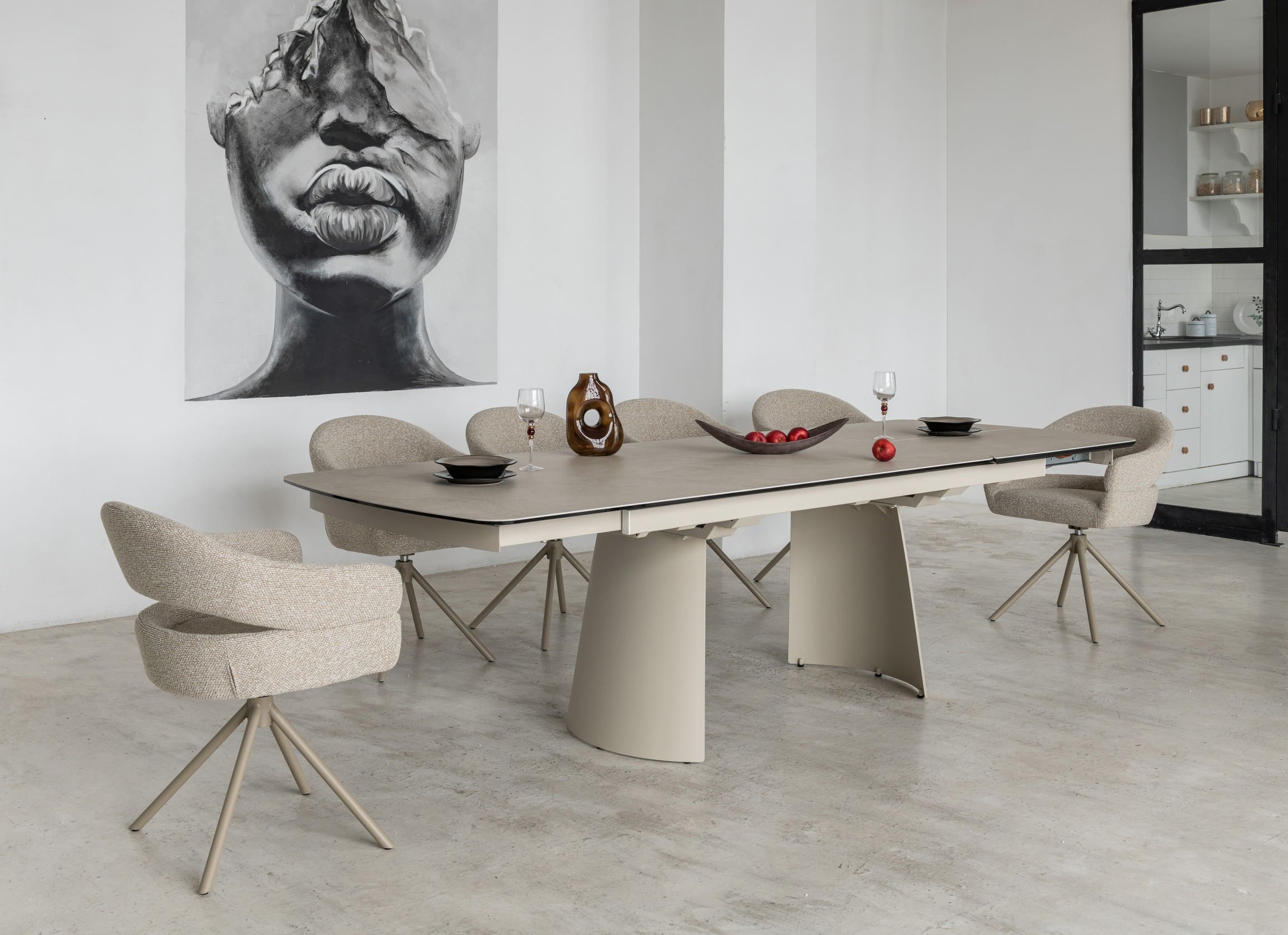 Його стільниця з матової кераміки в поєднанні з гартованим склом в благородному відтінку делікато беж виглядає вишукано й водночас стримано, даруючи простору світло, гармонію та відчуття затишку. Міцна металева основа, пофарбована в тон, створює цілісний образ та підкреслює сучасний характер моделі.