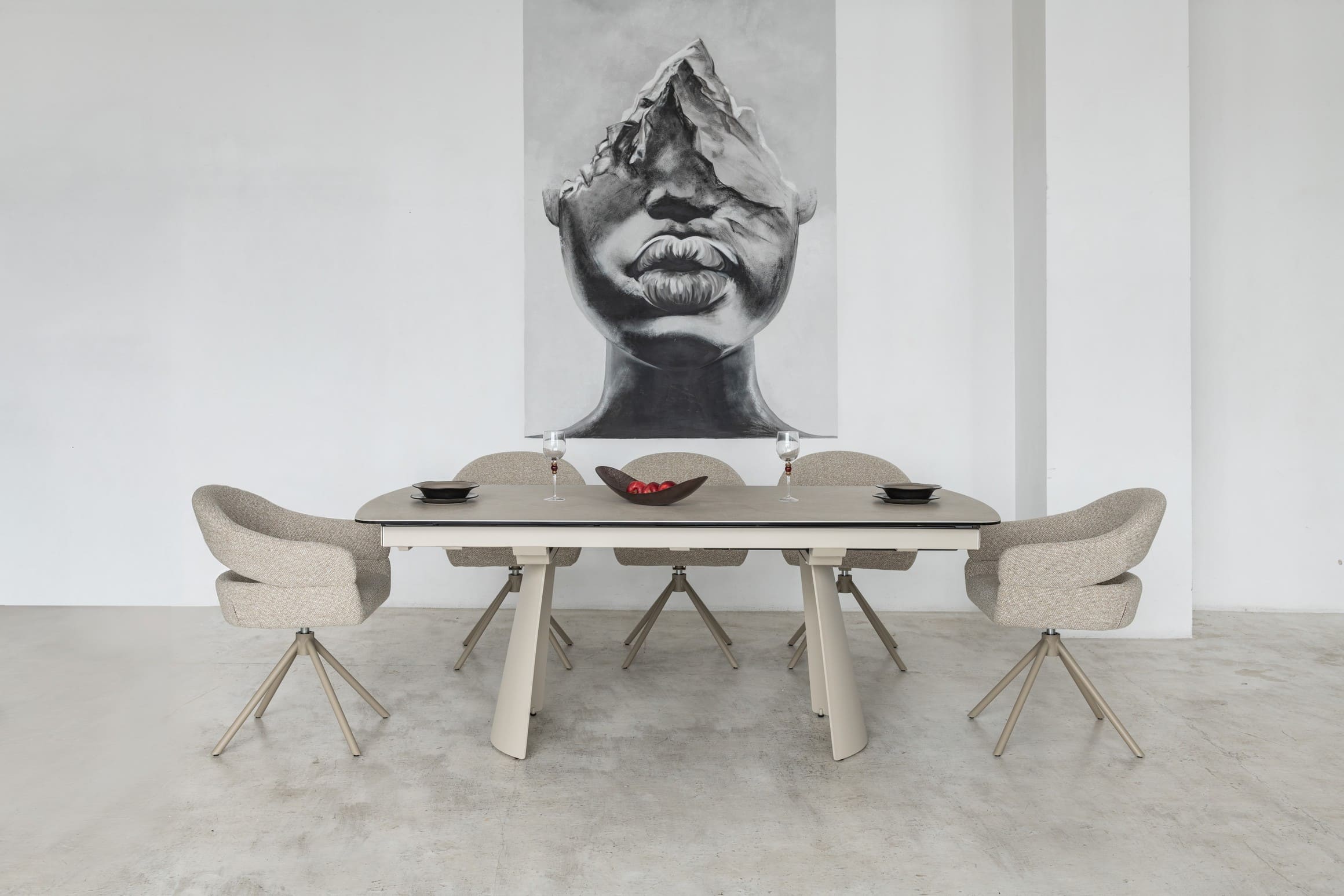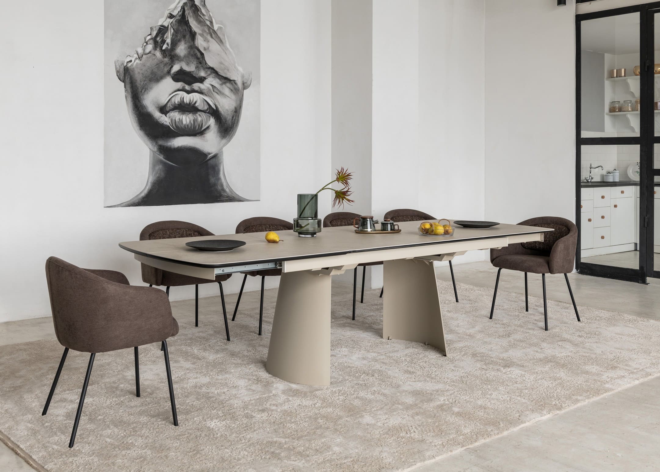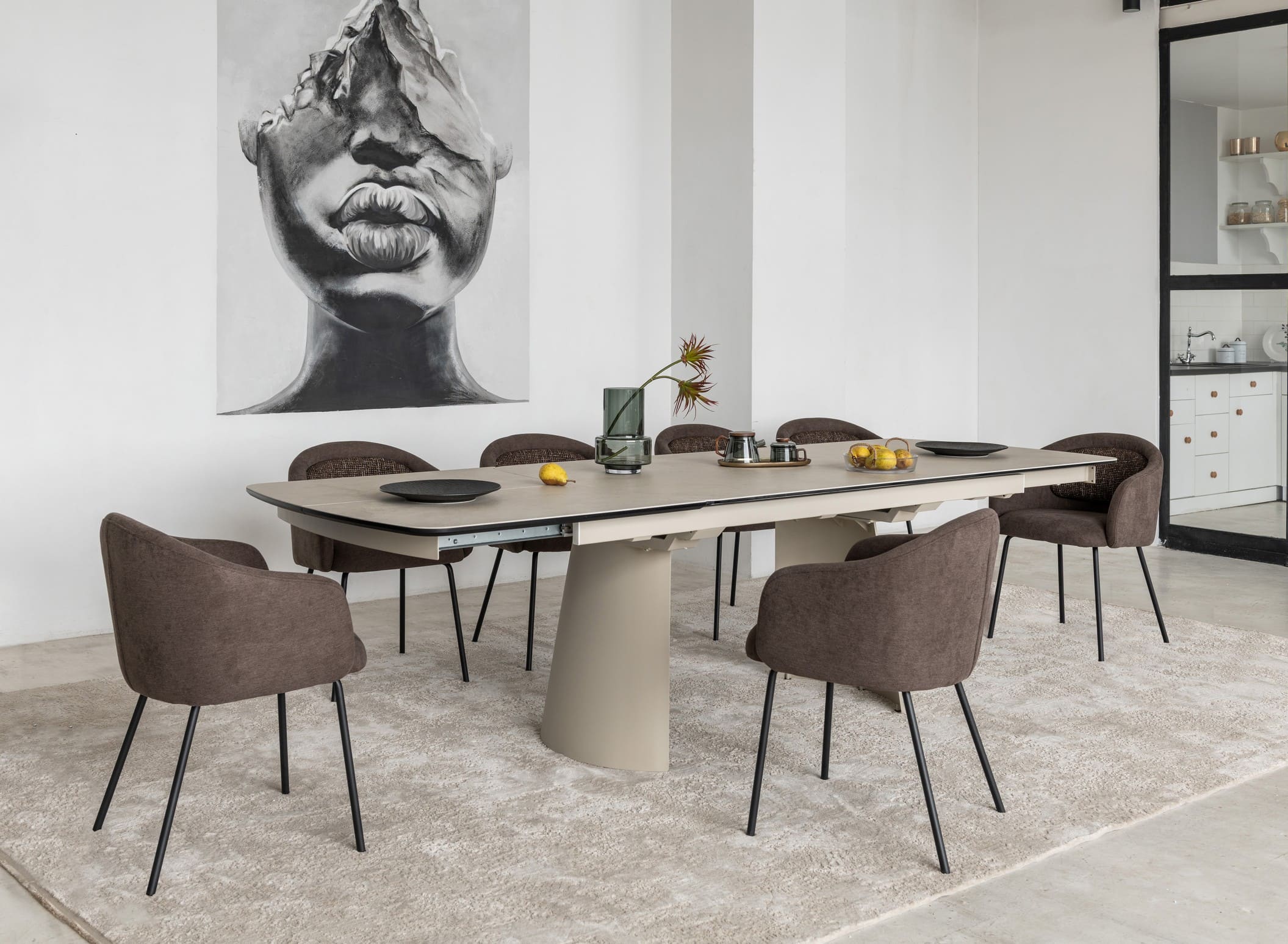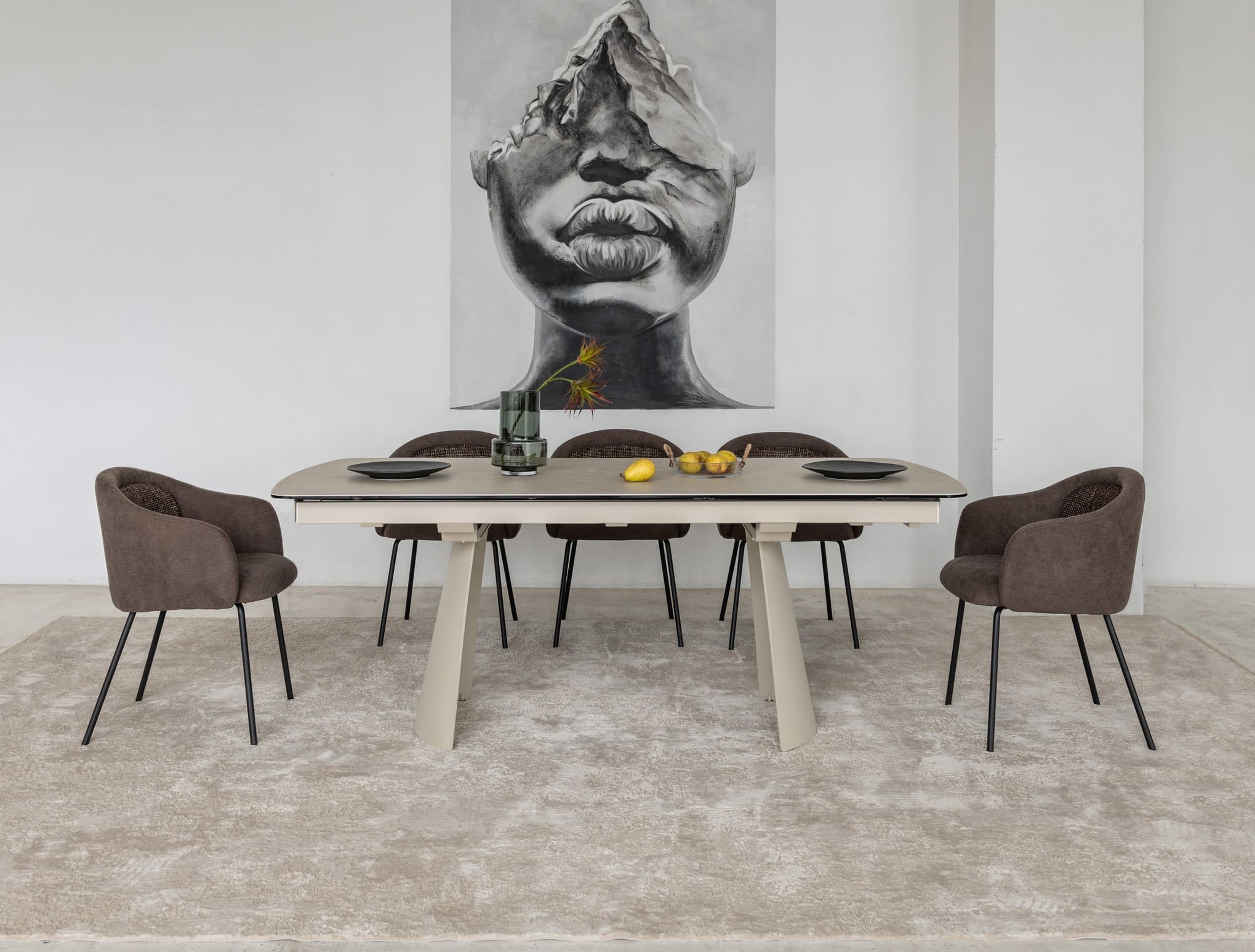 Його стільниця з матової кераміки в поєднанні з гартованим склом в благородному відтінку делікато беж виглядає вишукано й водночас стримано, даруючи простору світло, гармонію та відчуття затишку. Міцна металева основа, пофарбована в тон, створює цілісний образ та підкреслює сучасний характер моделі.