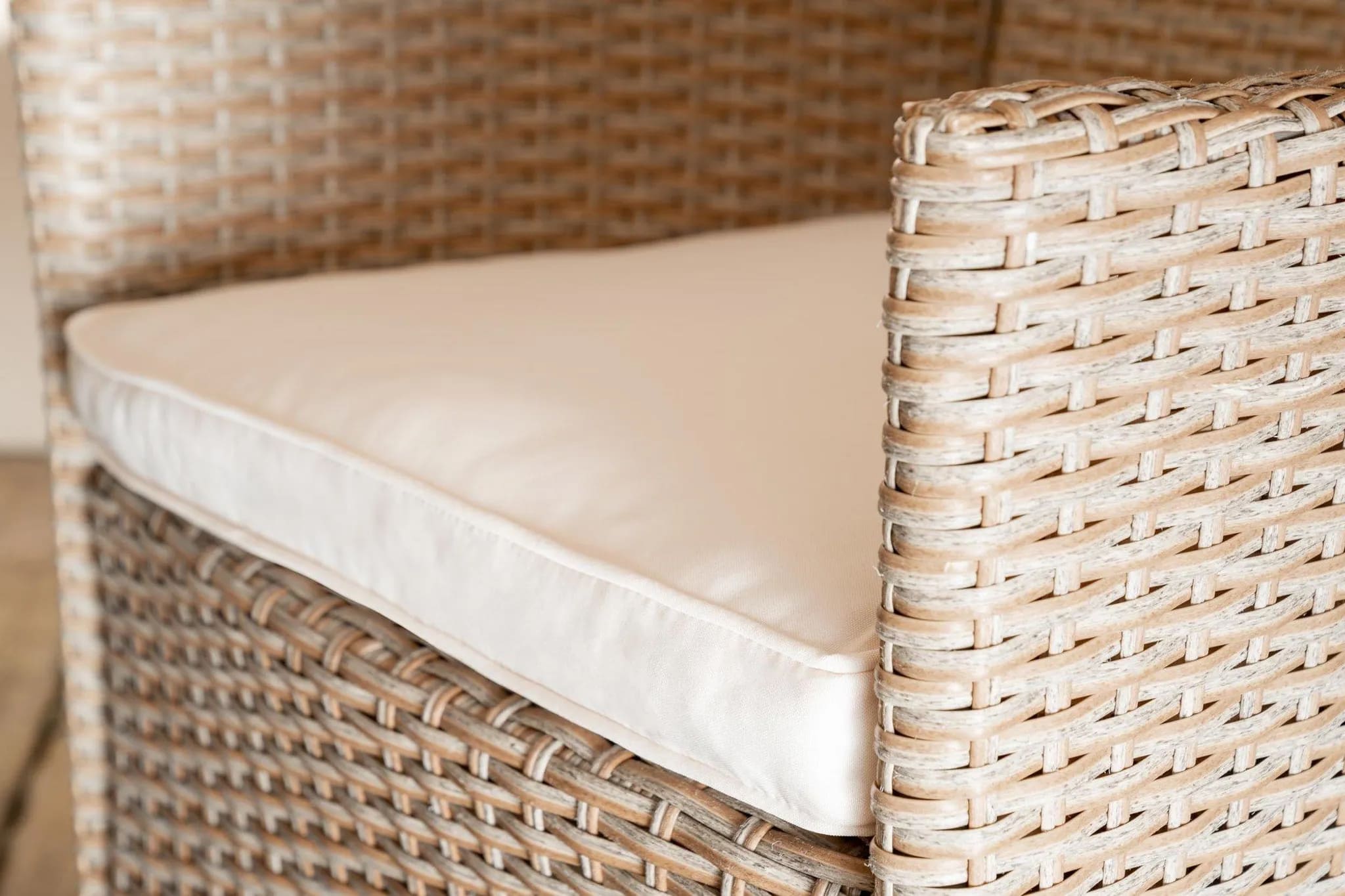 - Верхня оббивка, виготовлена зі штучного ротанга, відмінно протистоїть палючому сонцю, сильними дощами та будь-яким іншим погодним умовам.
