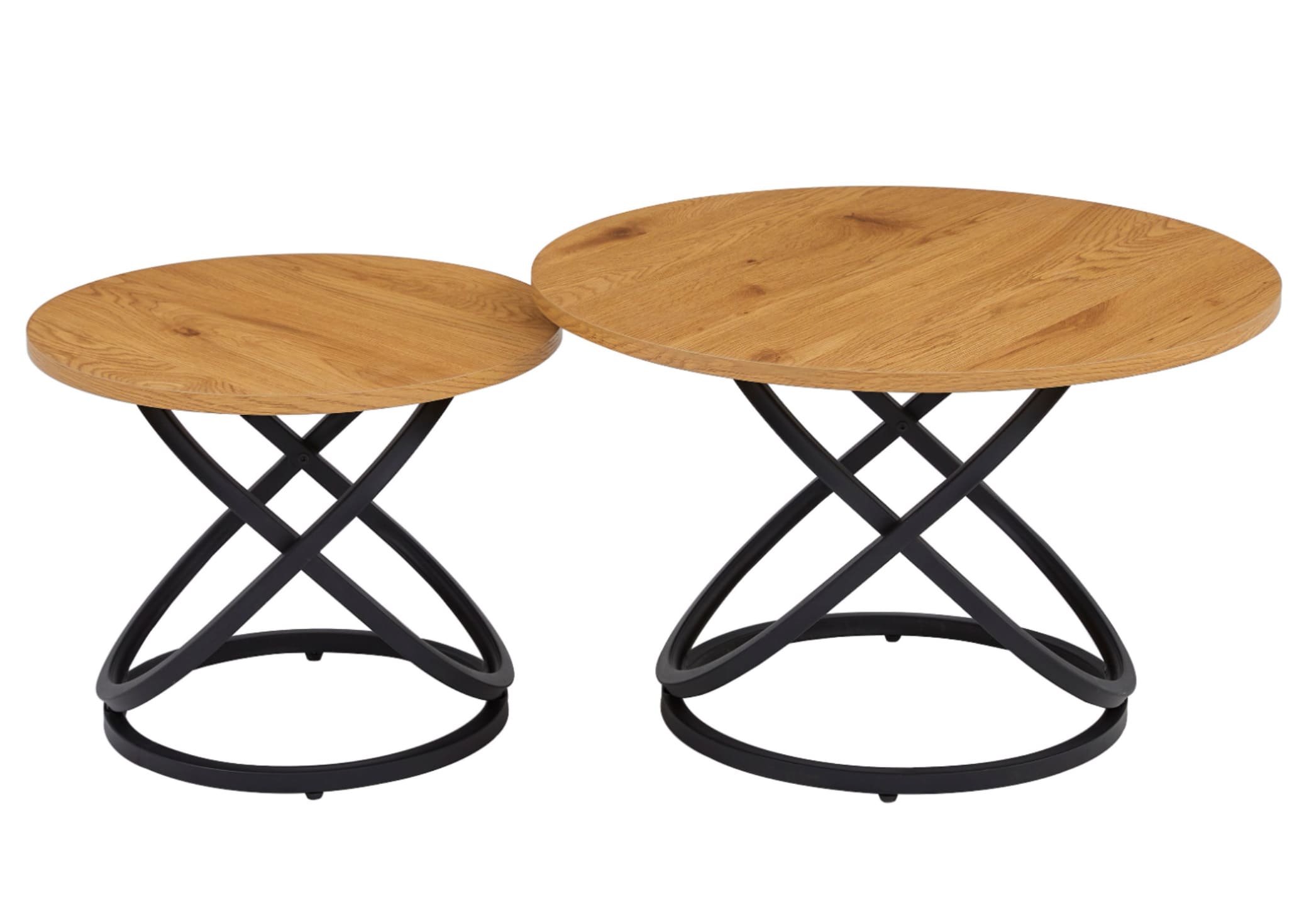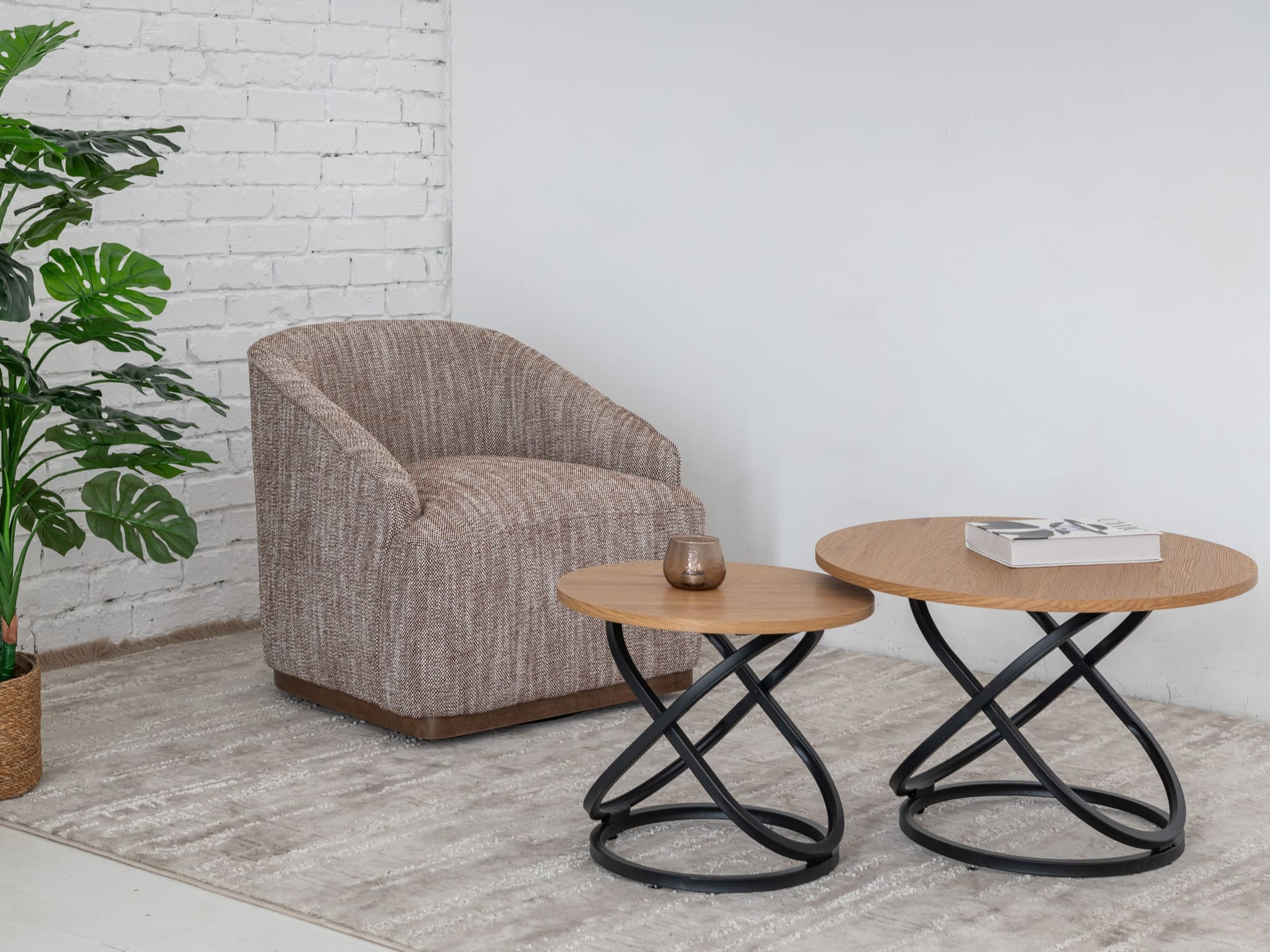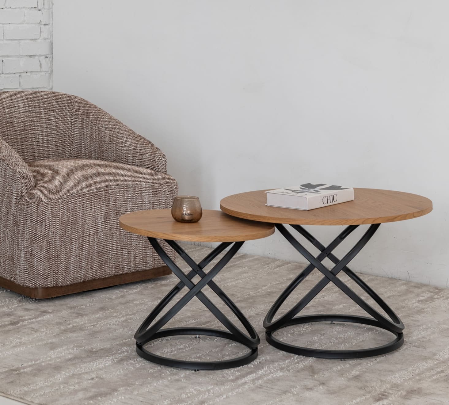 Столики різного розміру з круглими стільницями в теплому дубовому відтінку додають інтер'єру глибини та багатошаровості, а чорна металева основа підкреслює графічність та стійкість форм.