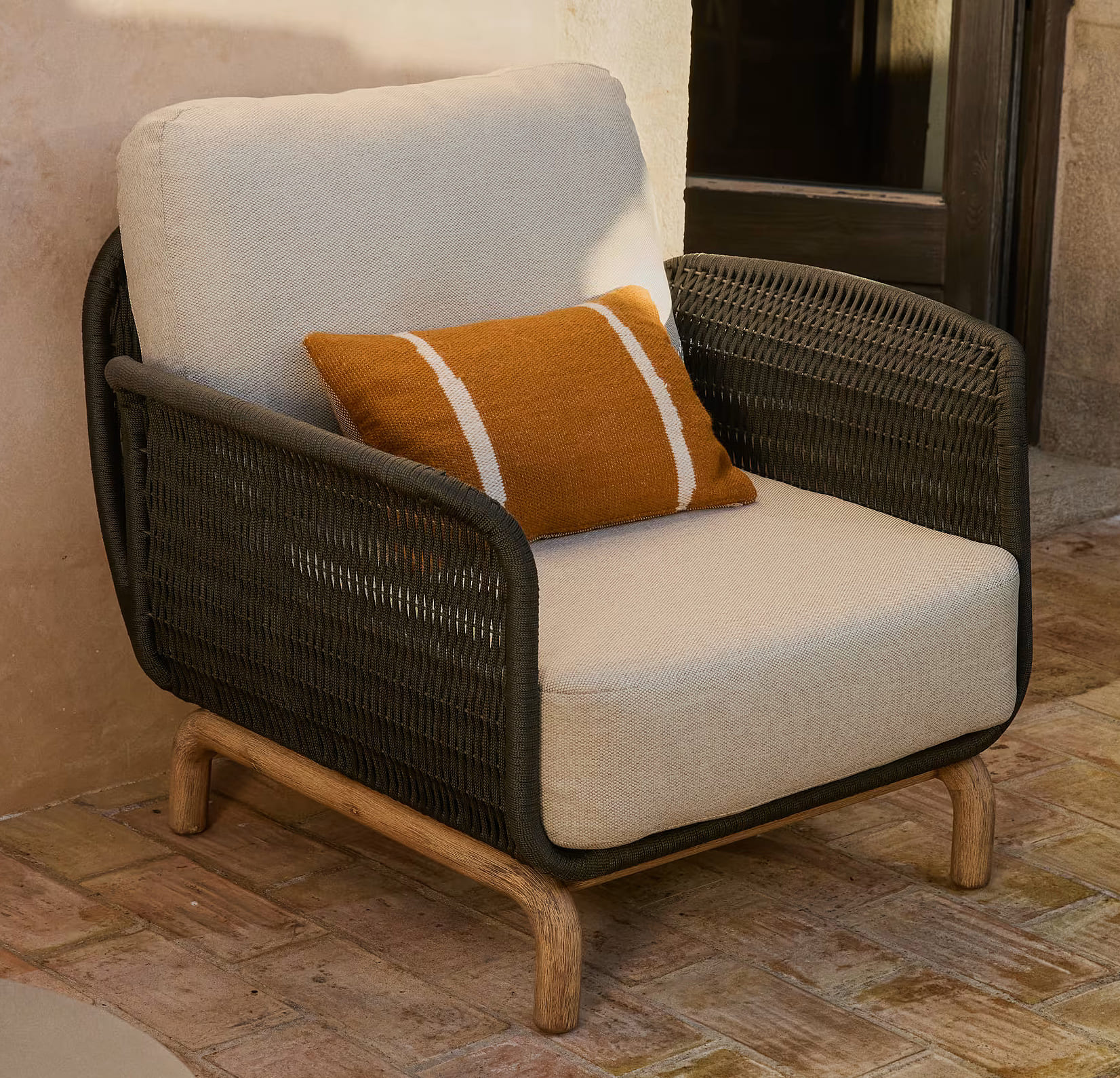Крісло виготовлене з масиву акації з унікальним природним малюнком, а сидіння та спинка виконані з вручну плетеного синтетичного шнура, що створює відчуття легкості та комфорту. Матеріали стійкі до зовнішніх впливів і підходять для використання як на вулиці, так і в приміщенні.