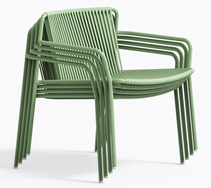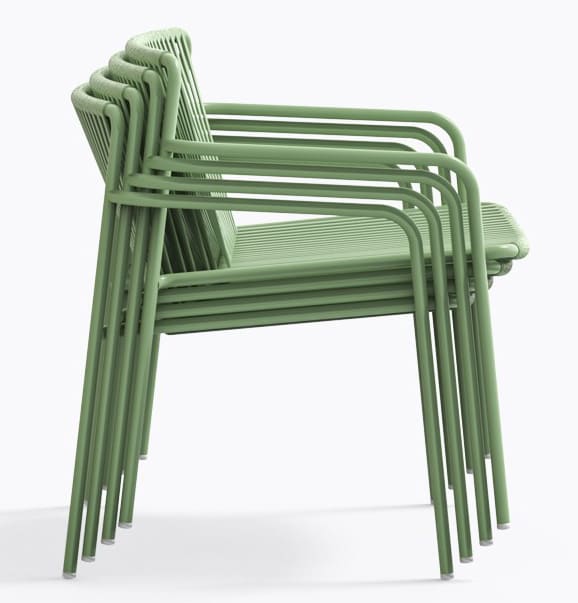 Крісло підходить для використання на вулиці, легко штабелюється та доступне у різних кольорах, що робить його універсальним рішенням для дому та HoReCa.