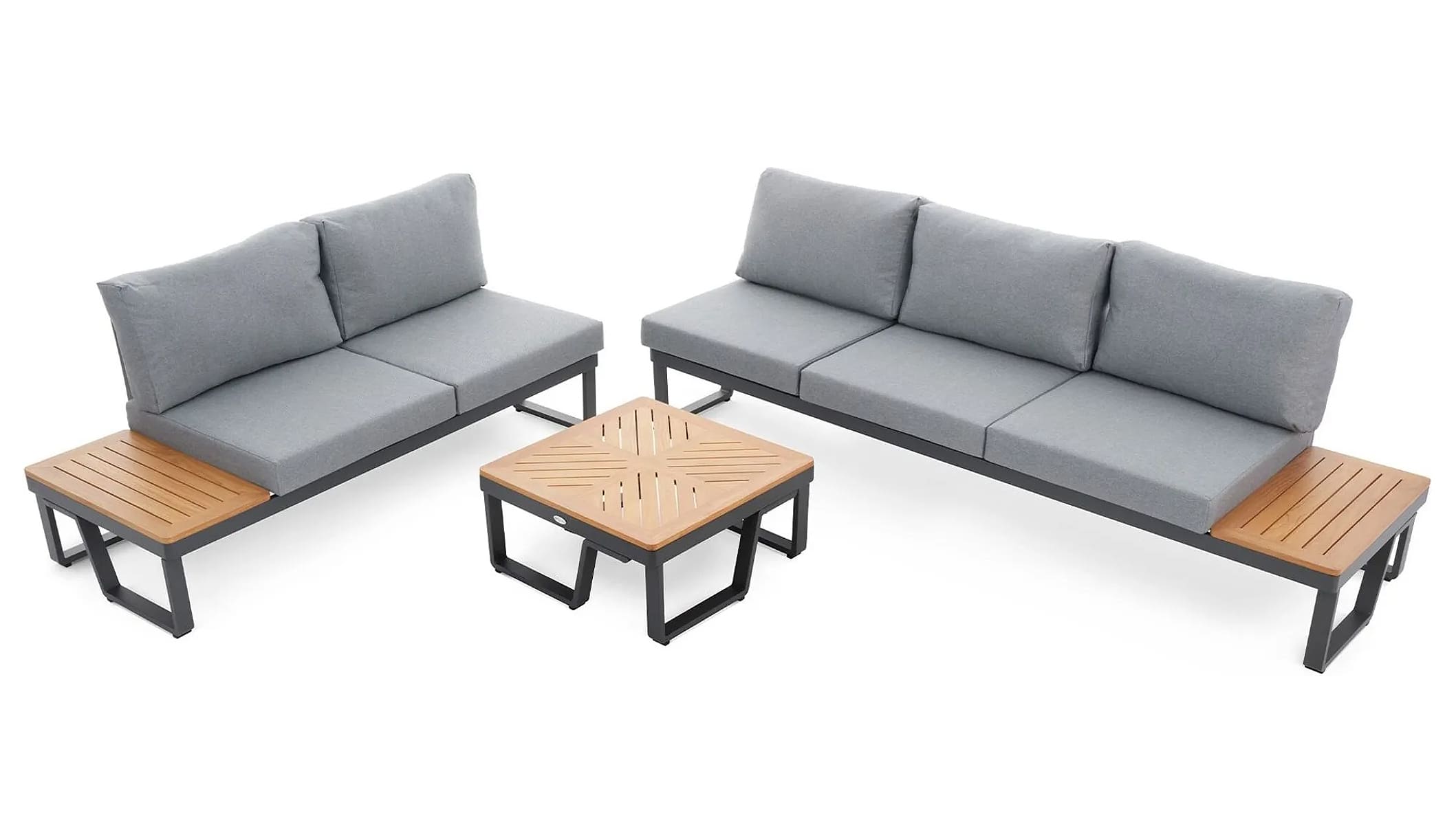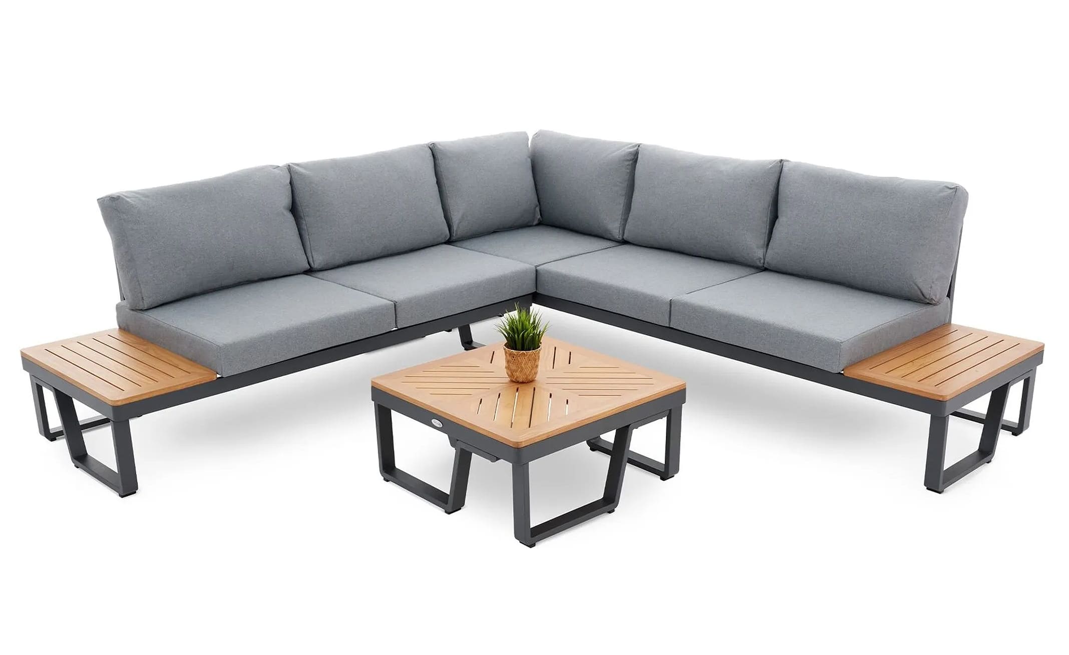 Каркас виконаний із міцного алюмінію з порошковим покриттям, стійкого до корозії та погодних умов, а елементи з натуральної деревини сосни надають меблям теплий та стильний зовнішній вигляд.