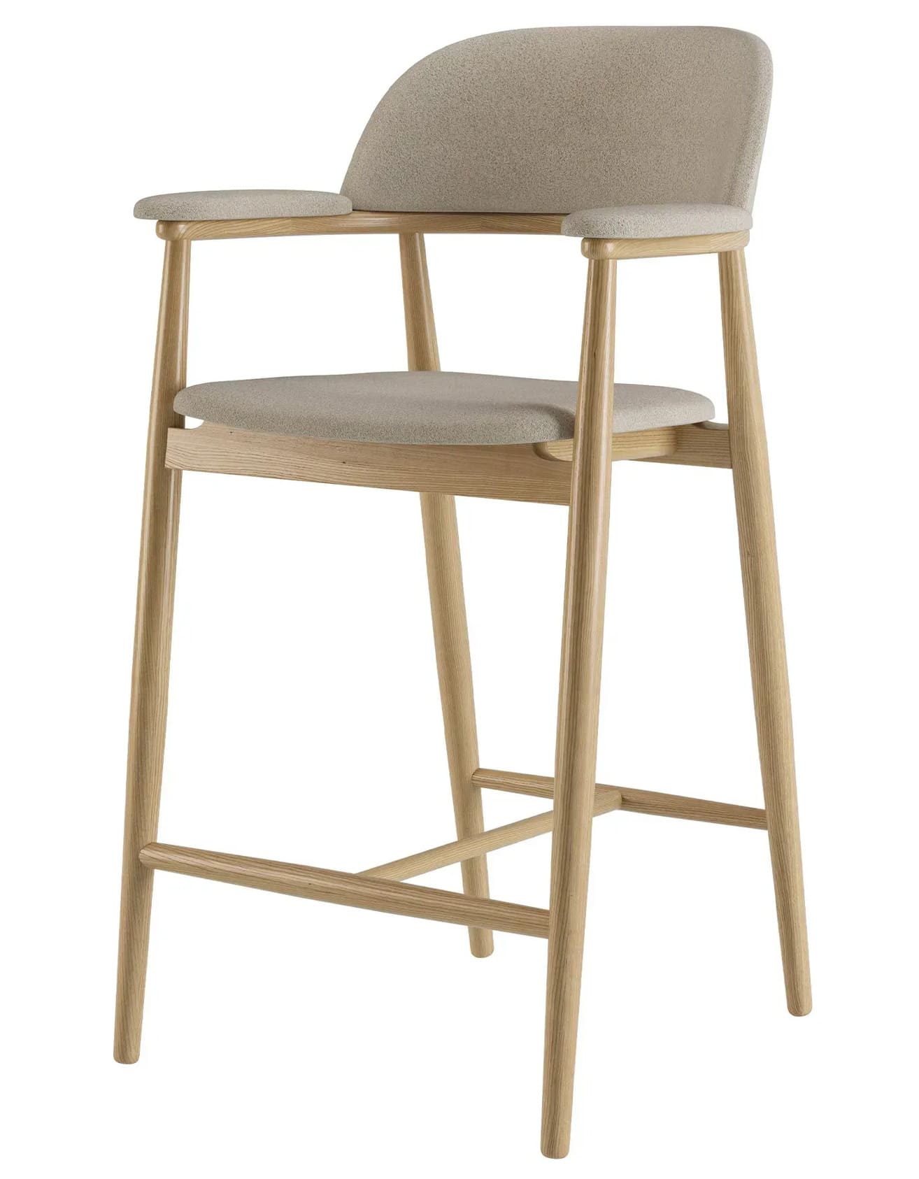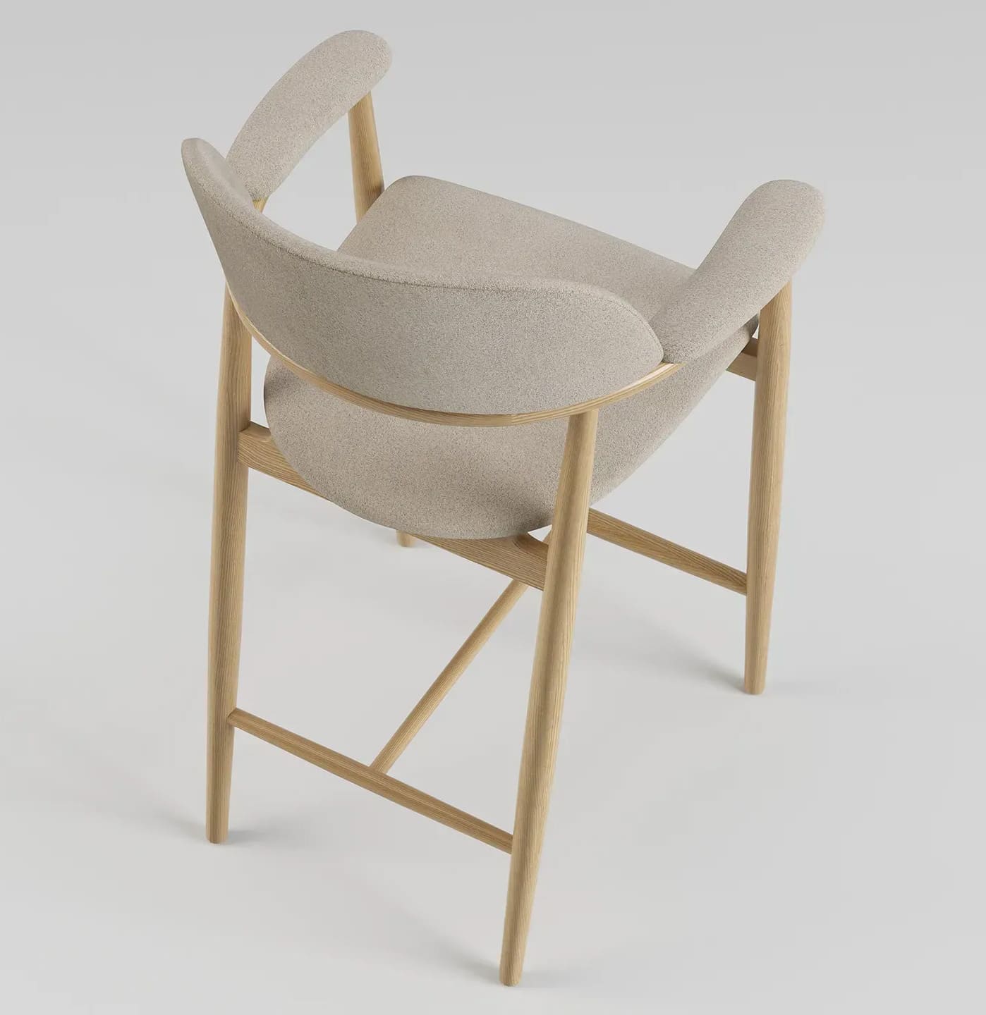 - М’яке сидіння та спинка забезпечують комфорт під час тривалого користування, а оббивка виготовляється на замовлення, що дозволяє підібрати тканину й фактуру під конкретний інтер’єр — від кухні та барної зони до кафе чи ресторану. Зручні підлокітники плавно інтегровані в конструкцію, підкреслюючи продуману геометрію стільця.