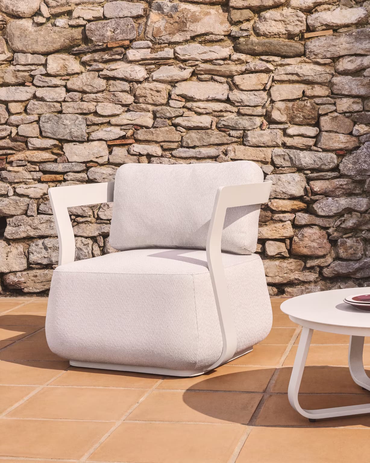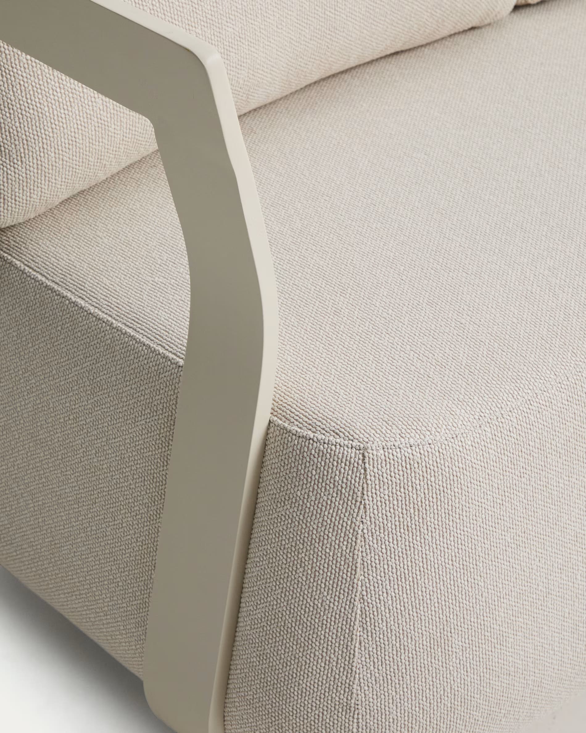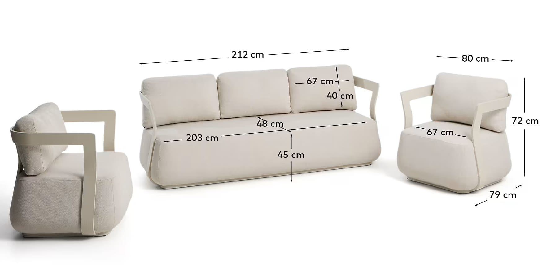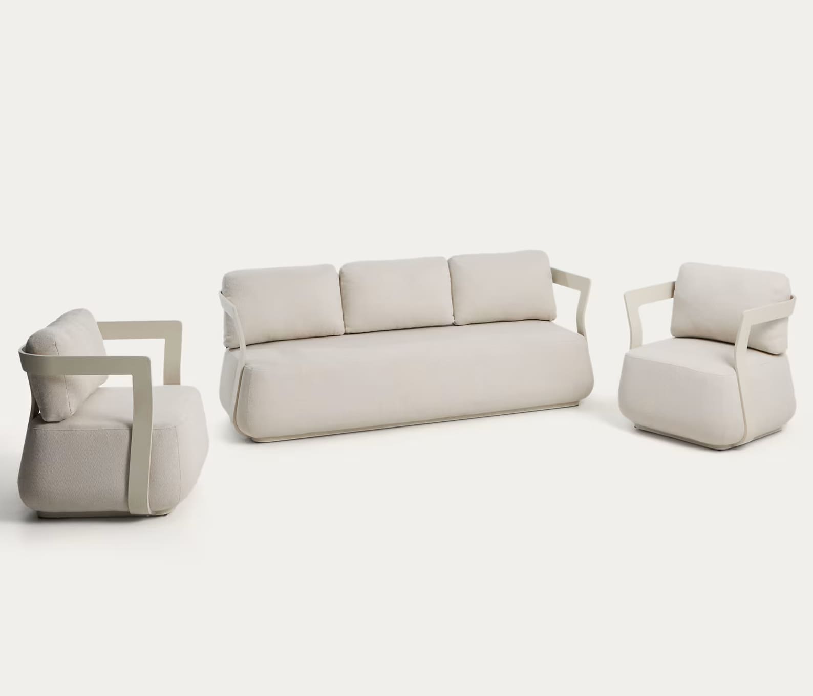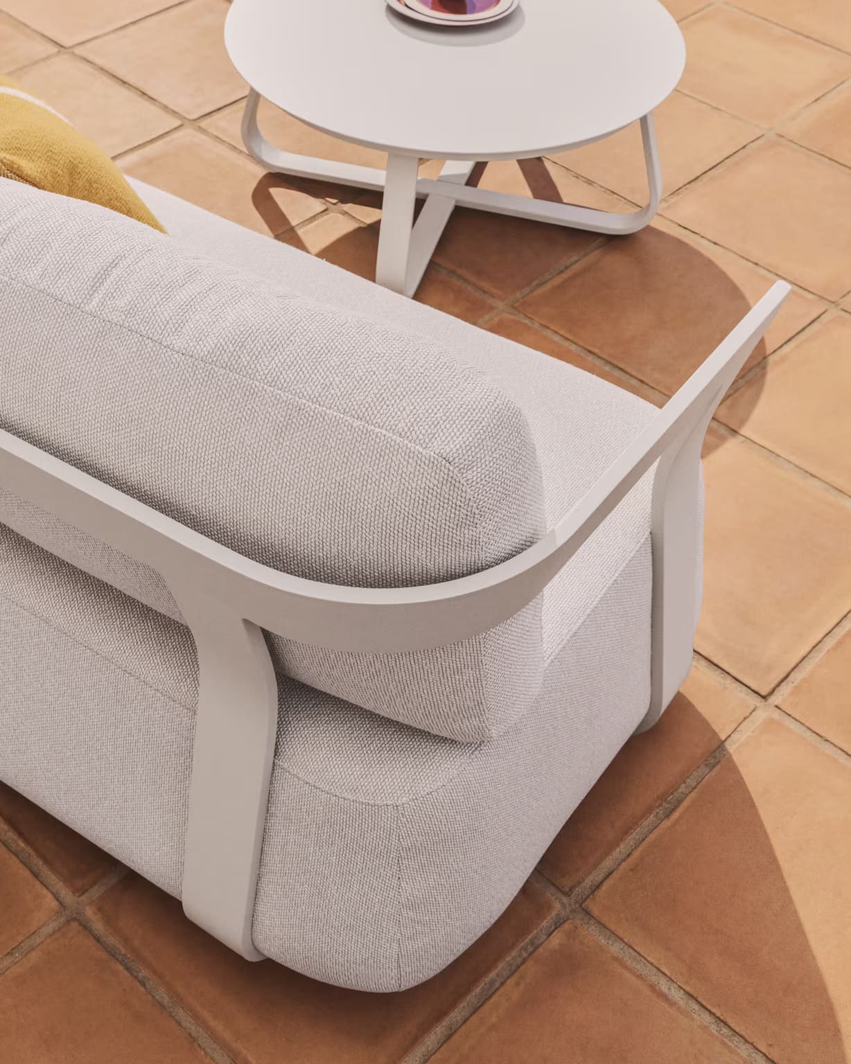 Садовий комплект меблів Kave Home Tamaris включає 3-місний диван та 2 крісла - ідеальне рішення для тераси, саду або зони відпочинку. Легкий та міцний алюмінієвий каркас стійкий до погодних умов та підходить для використання на вулиці.