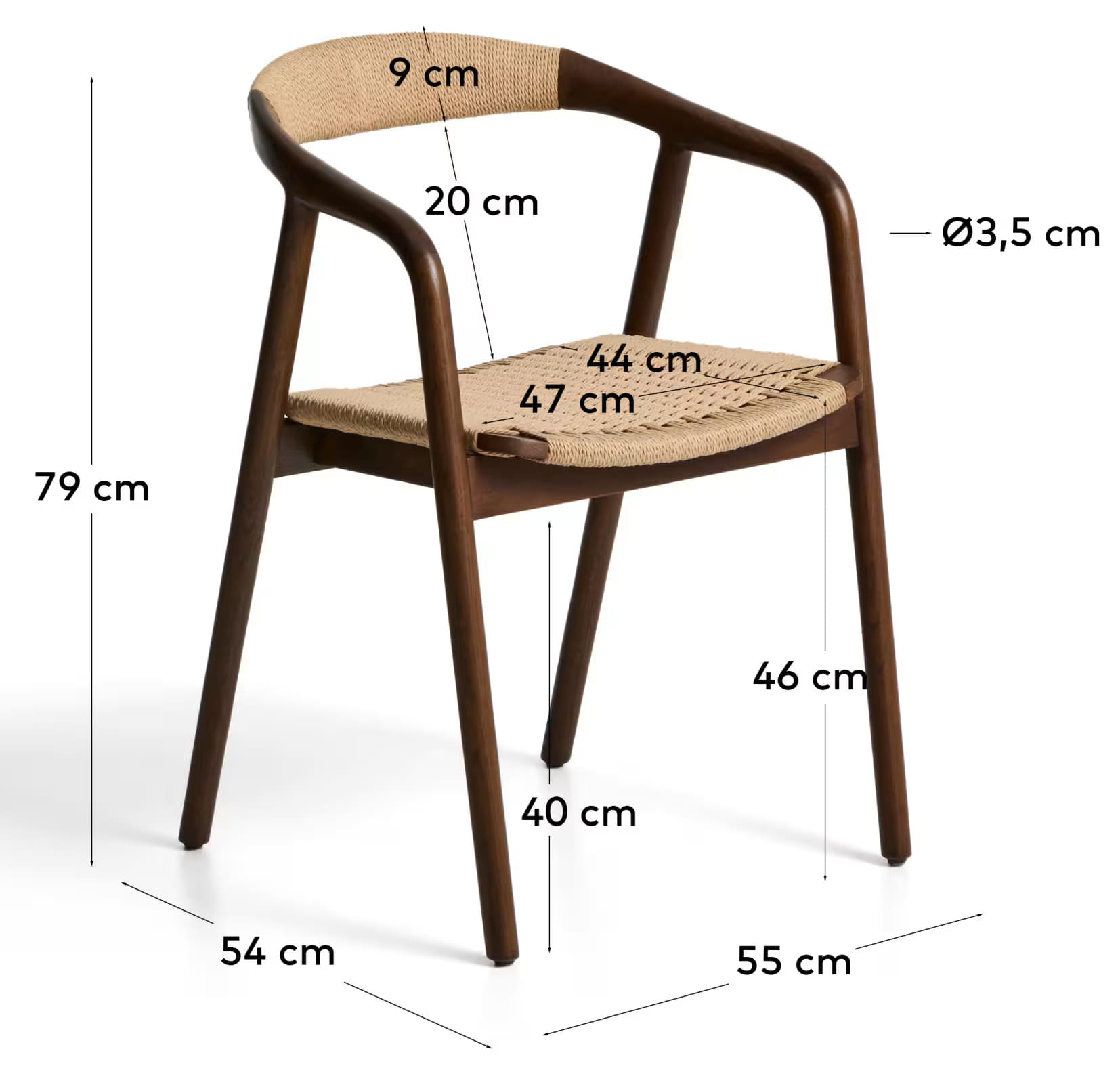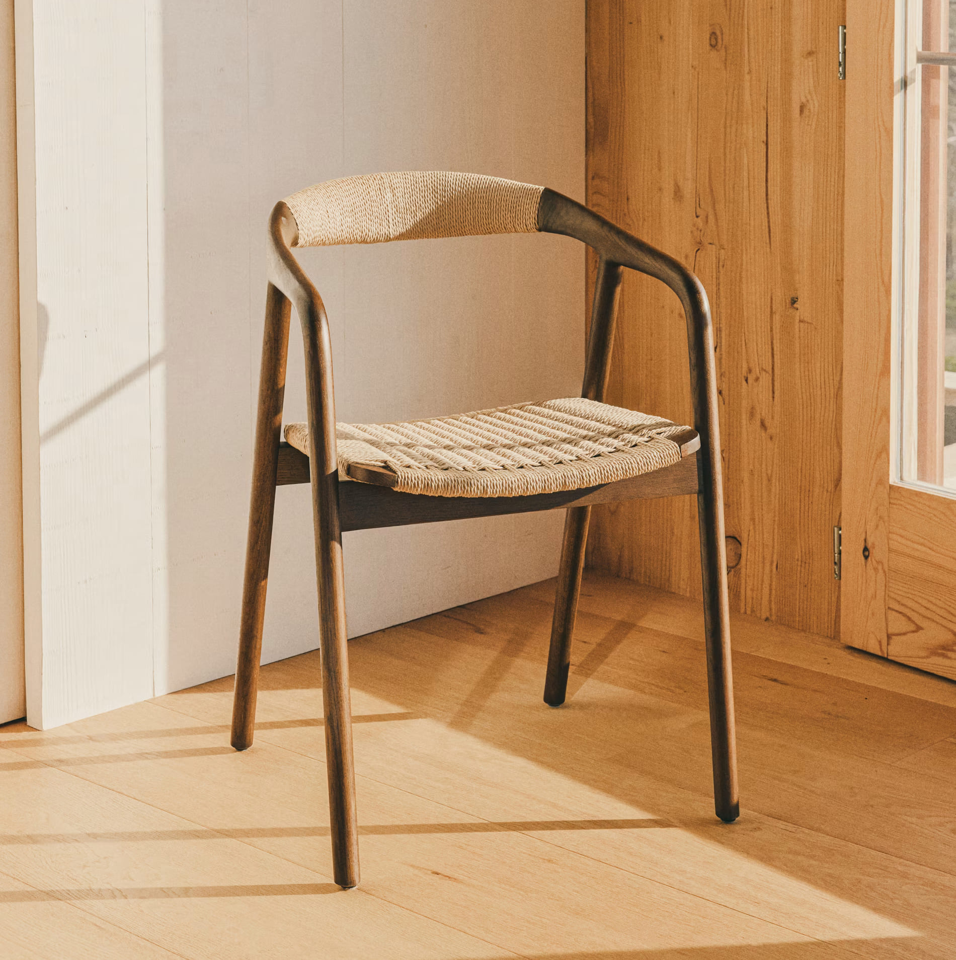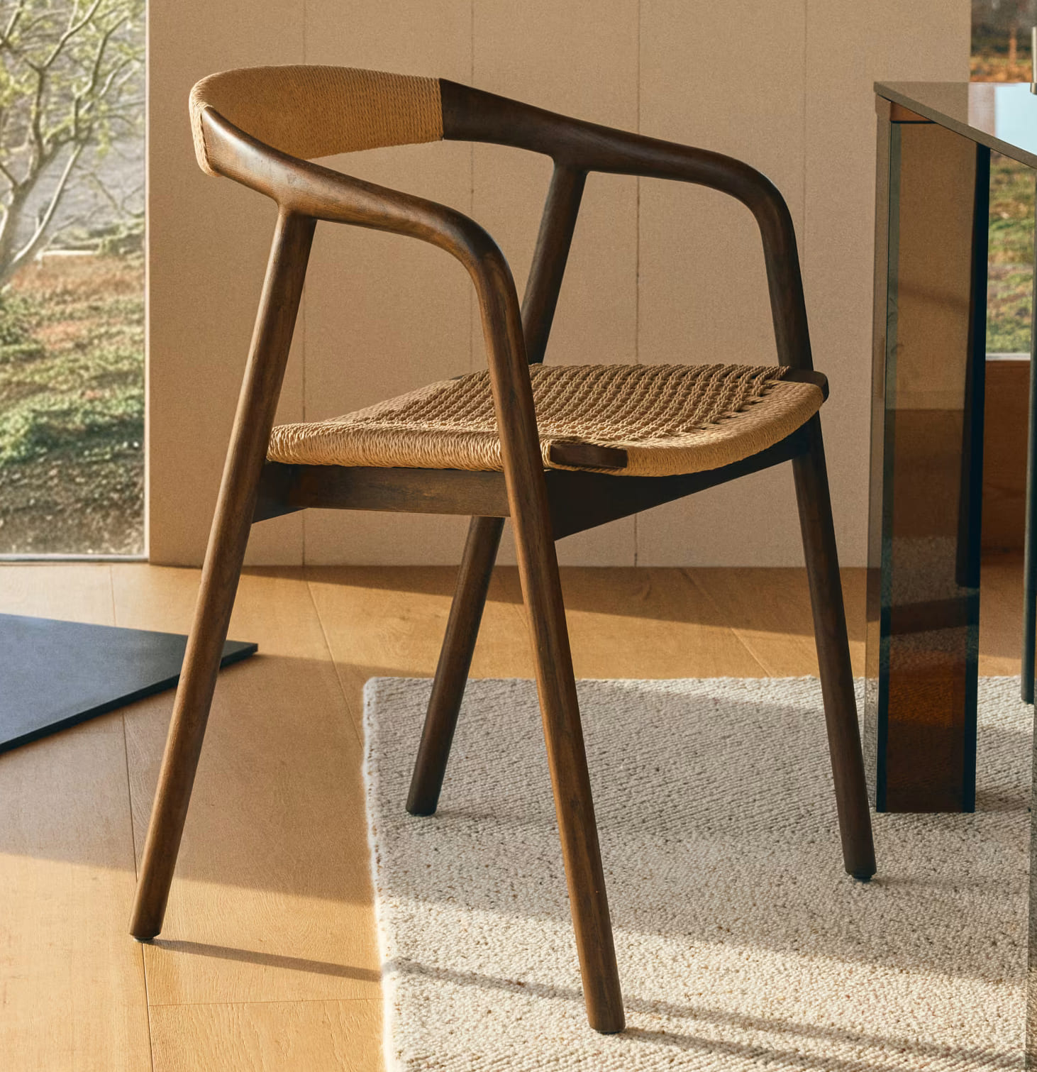 - Стілець виготовлений із масиву дуба, сидіння та спинка — зі сплетеної вручну мотузки.