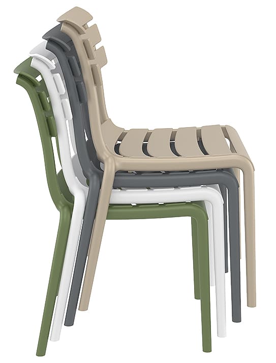 Модель представлена у різних кольорах. Штабелований вуличний стілець зручний для зберігання, транспортування та комерційного використання. Відмінний вибір для літнього майданчика, тераси чи стильного оформлення будинку.