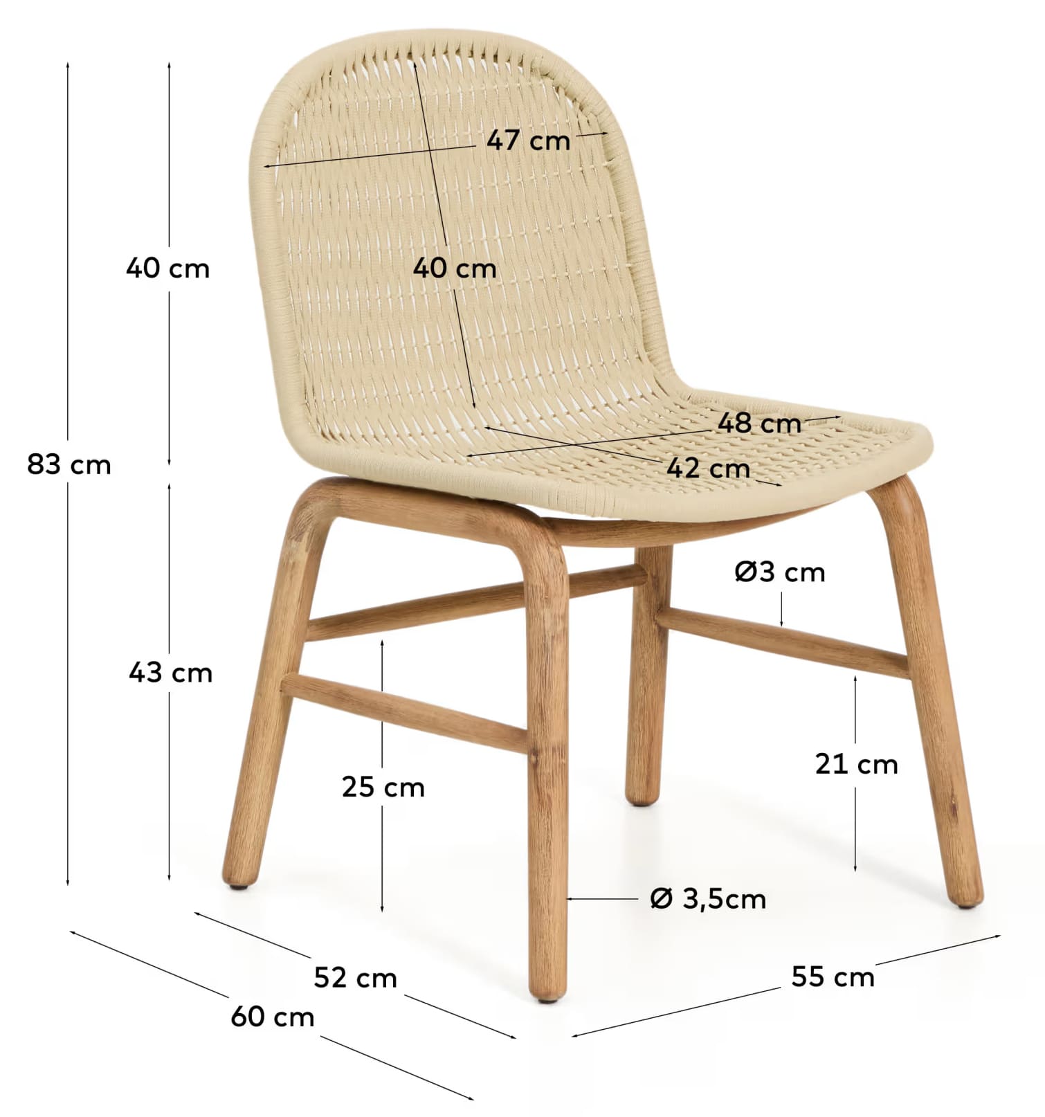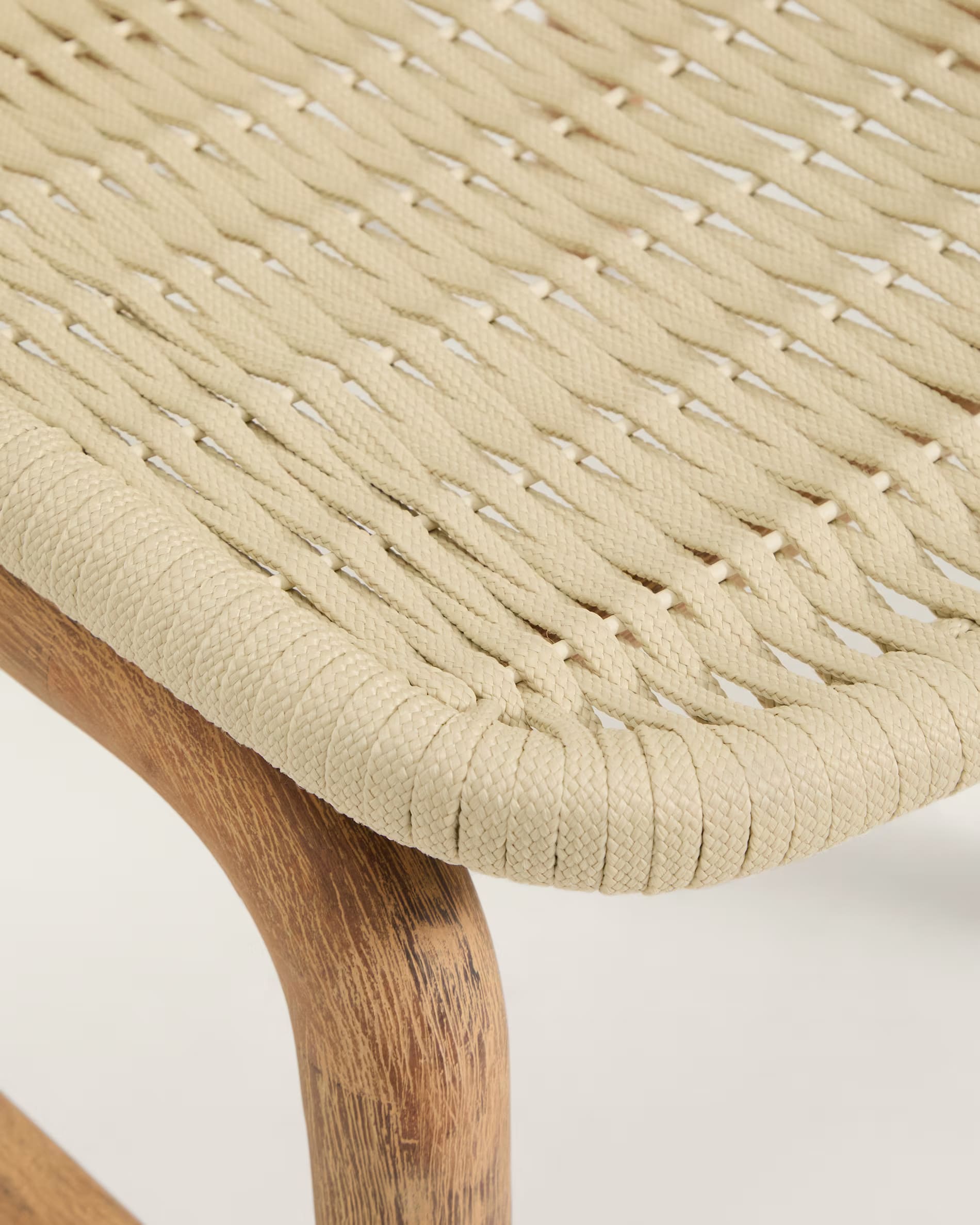 Стілець виготовлений із масиву акації з виразною природною текстурою, а сидіння з вручну плетеного синтетичного шнура забезпечує комфорт і довговічність. Матеріали стійкі до впливу сонця та підходять для використання як на вулиці, так і в приміщенні.