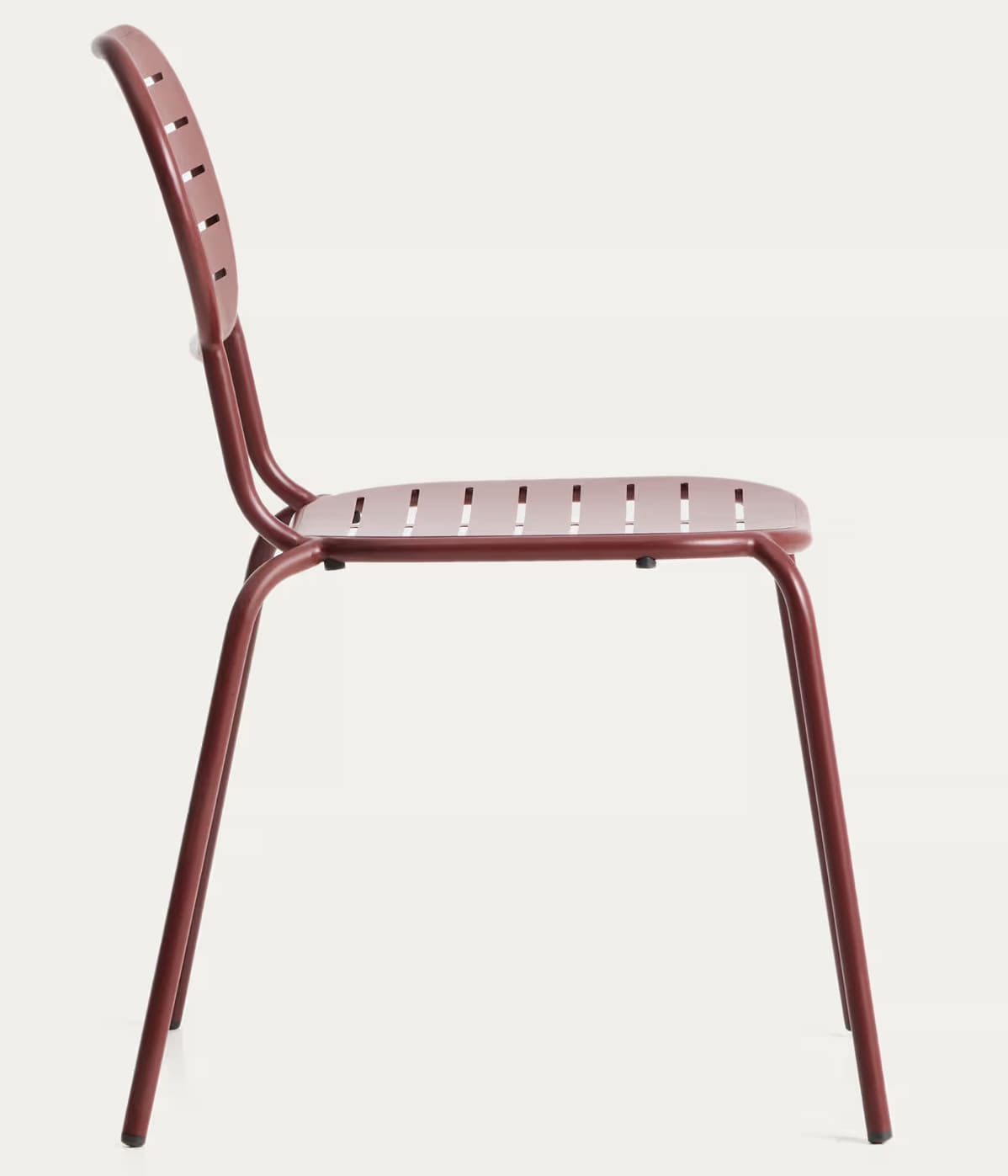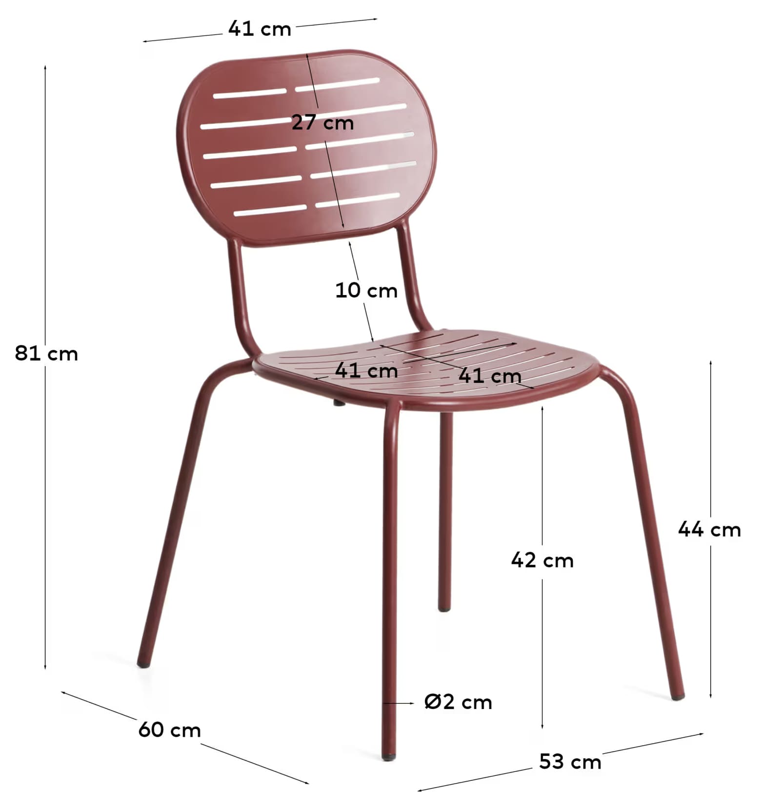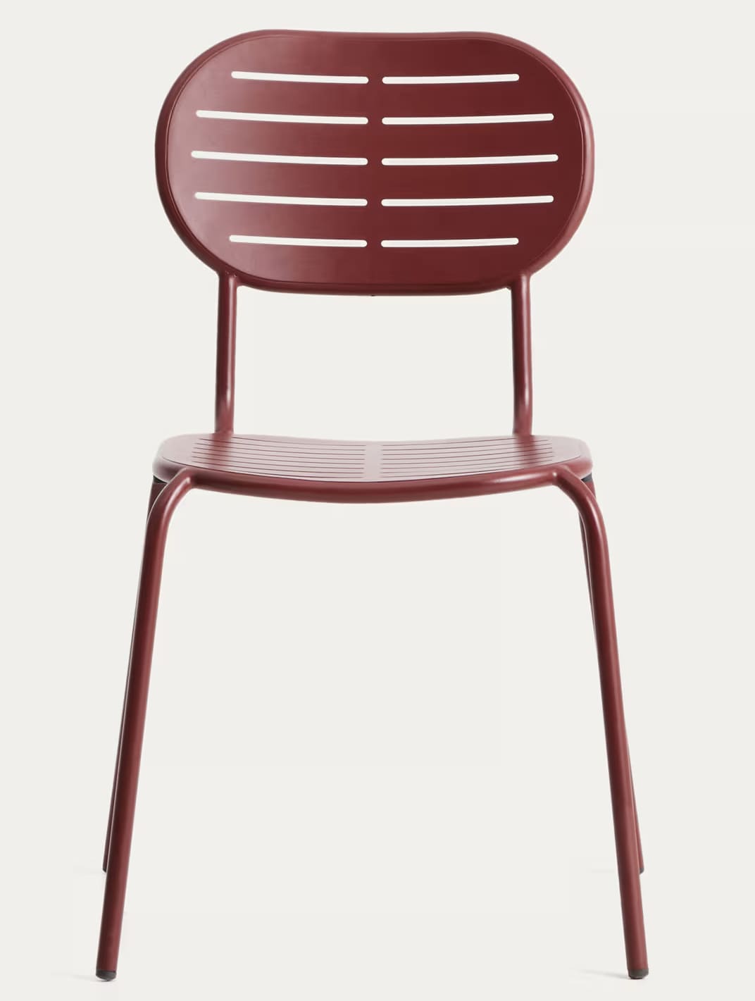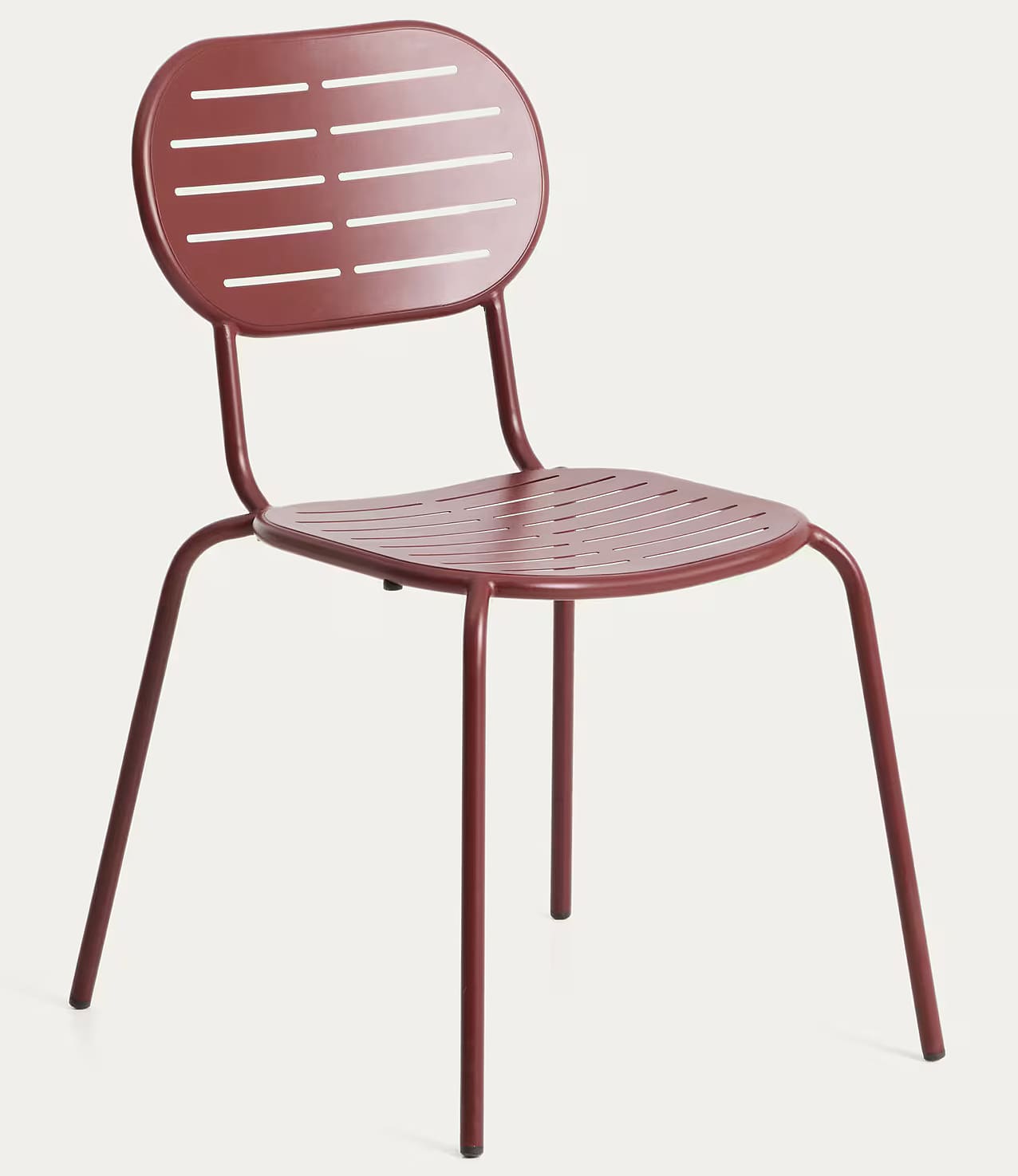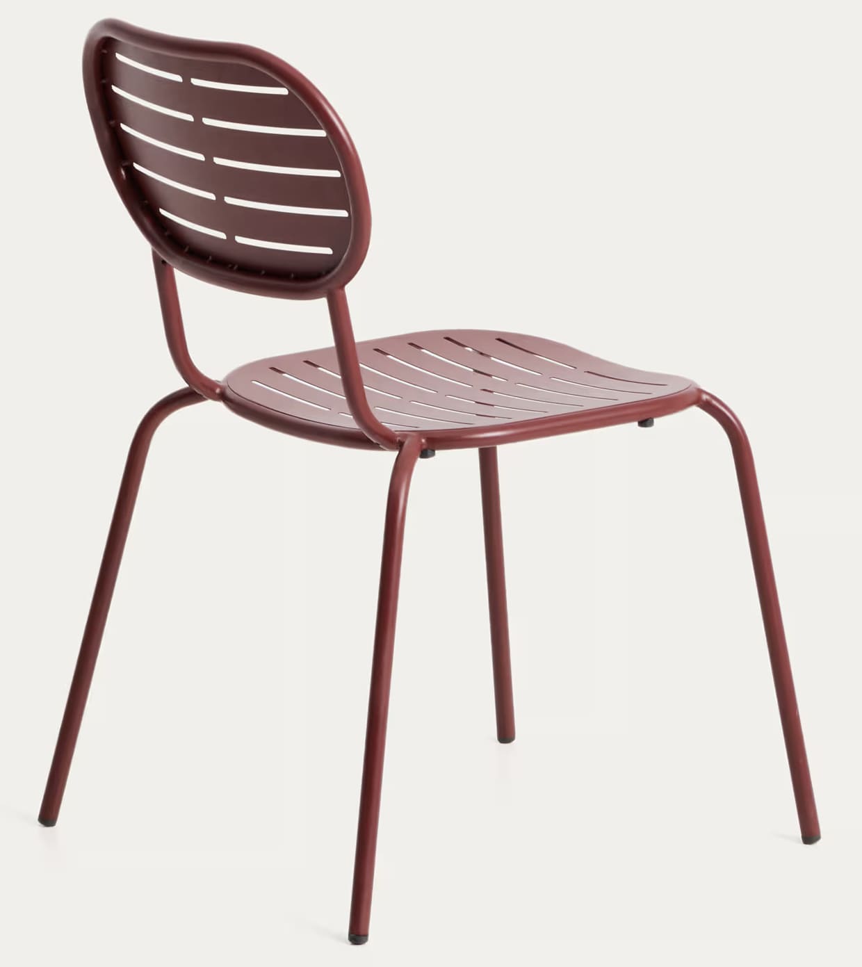 - Стул из оцинкованной стали с покрытием бордового цвета, устойчивый к окислению и коррозии, более долговечный, чем обычная сталь.
