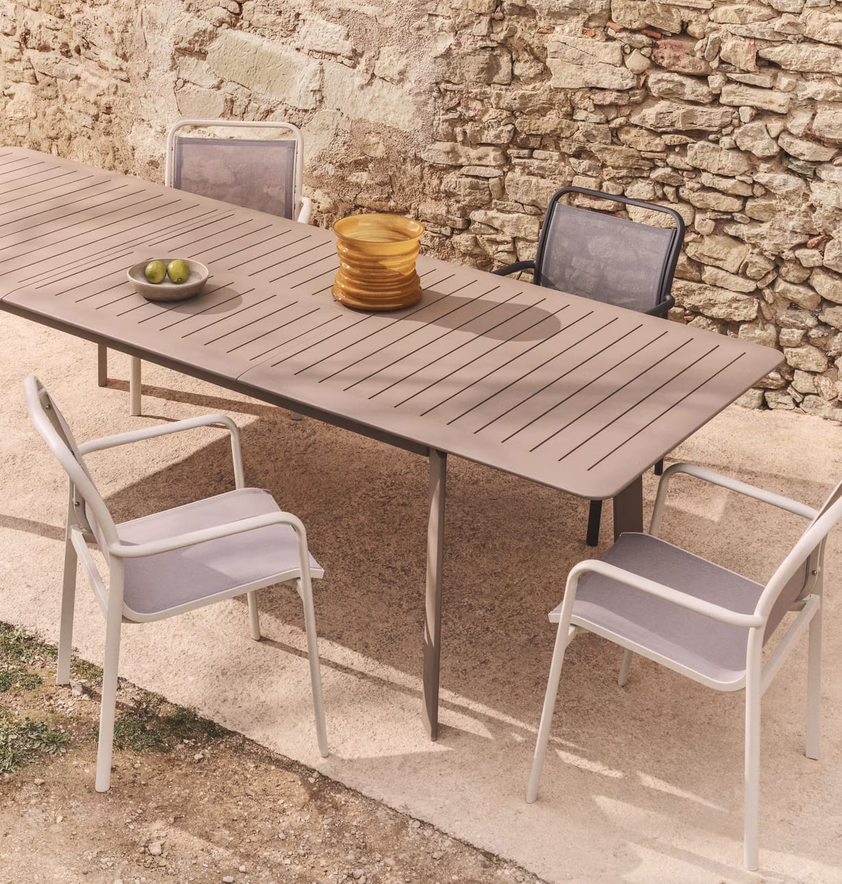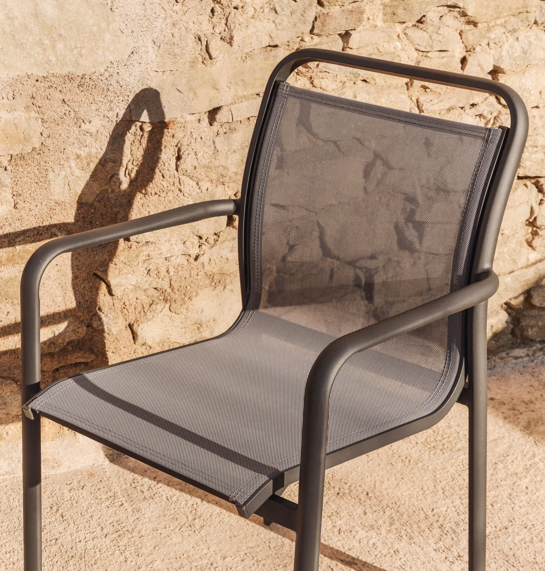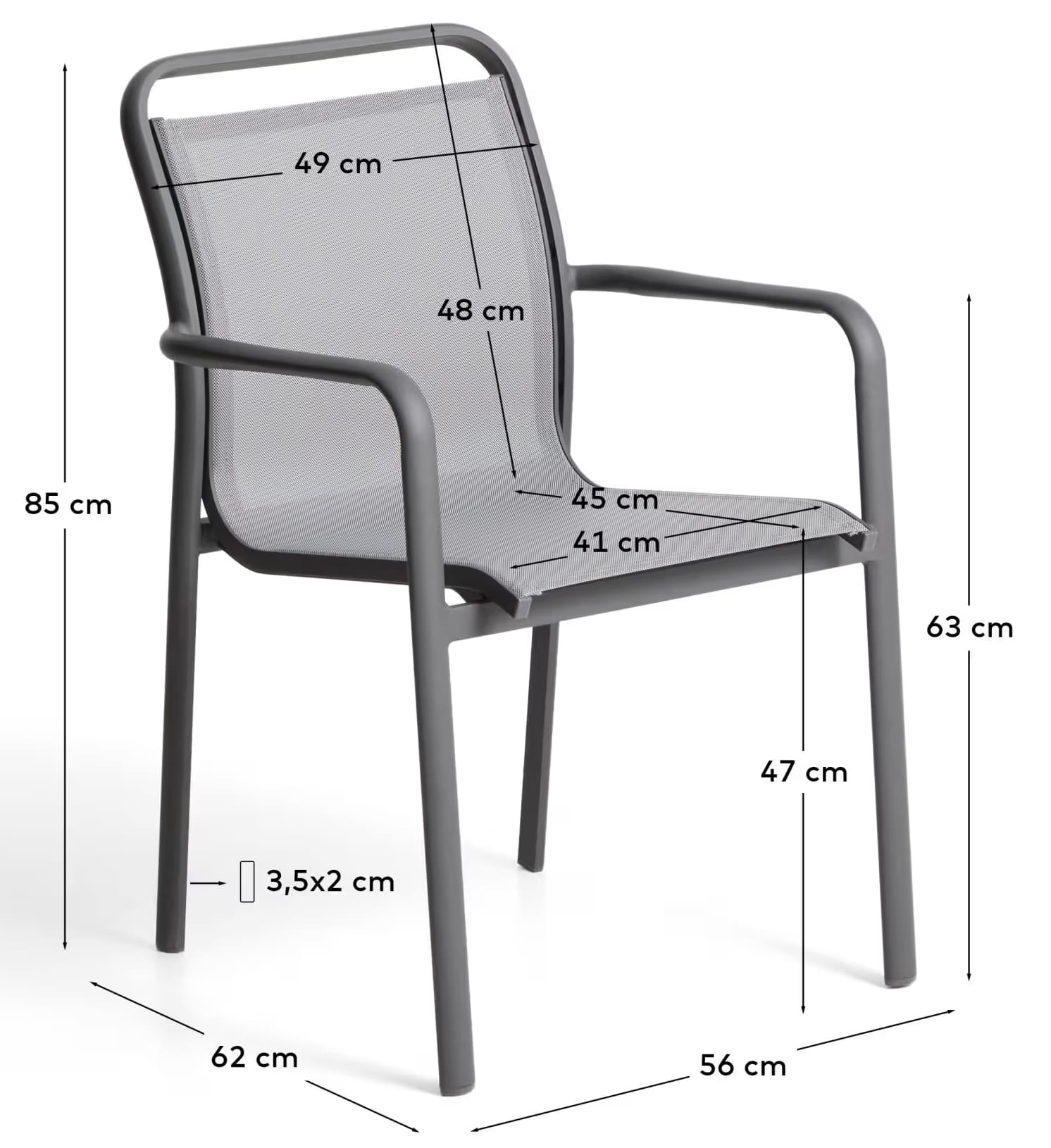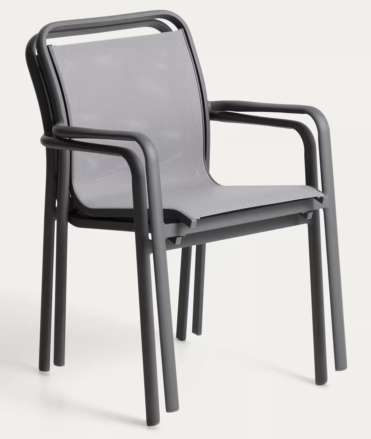 Современный уличный стул Luri от Kave Home — это практичное и универсальное решение для террасы, балкона, сада, кухни или ресторана. Легкий алюминиевый каркас в сочетании с сиденьем и спинкой из texteline обеспечивает комфорт, прочность и современный внешний вид.