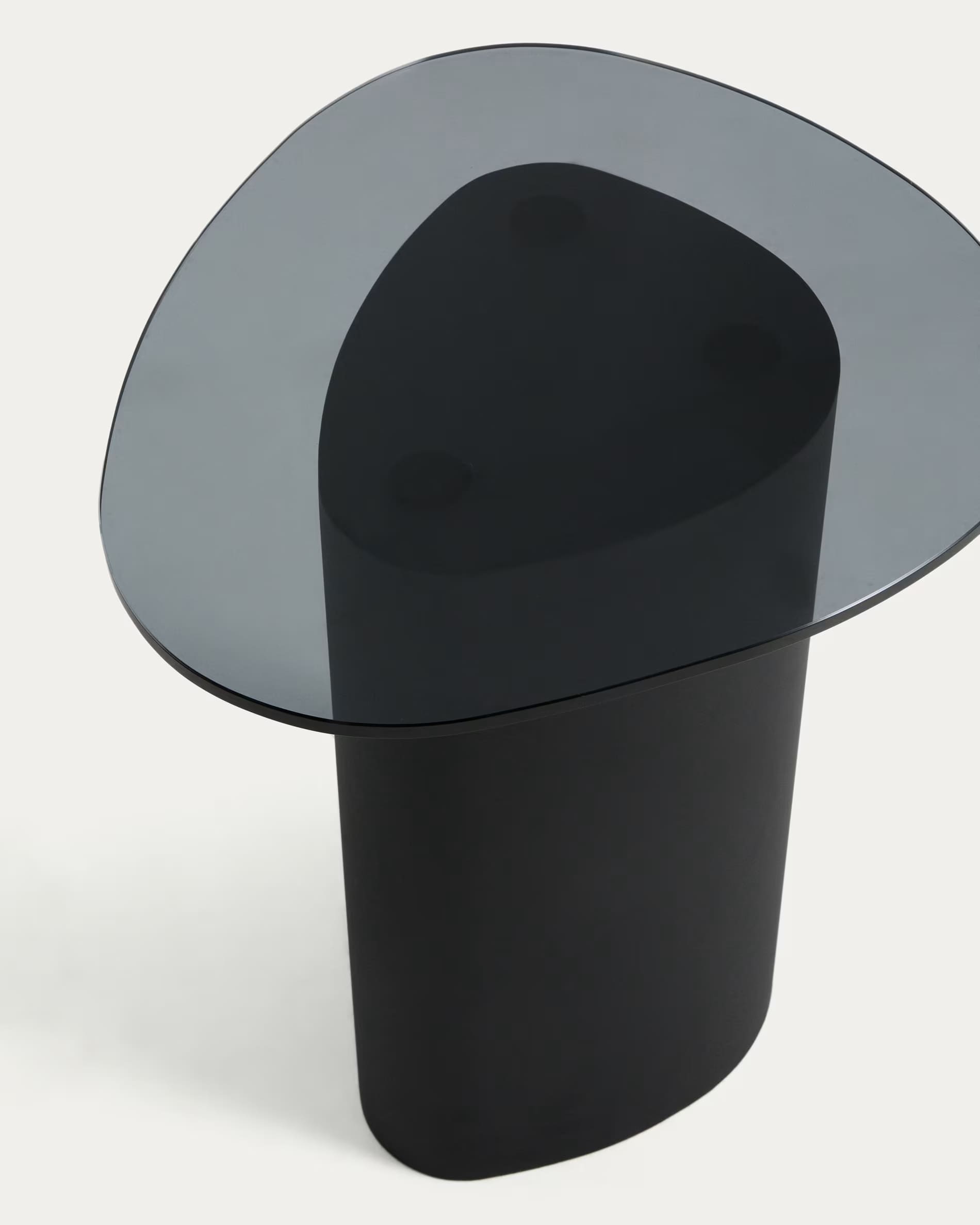 Столик сочетает прочный металлический каркас с защитным покрытием и столешницу из закаленного стекла с легким затемнением. Скульптурная форма основания придает дизайну выразительность, а стекло визуально облегчает пространство и пропускает свет.