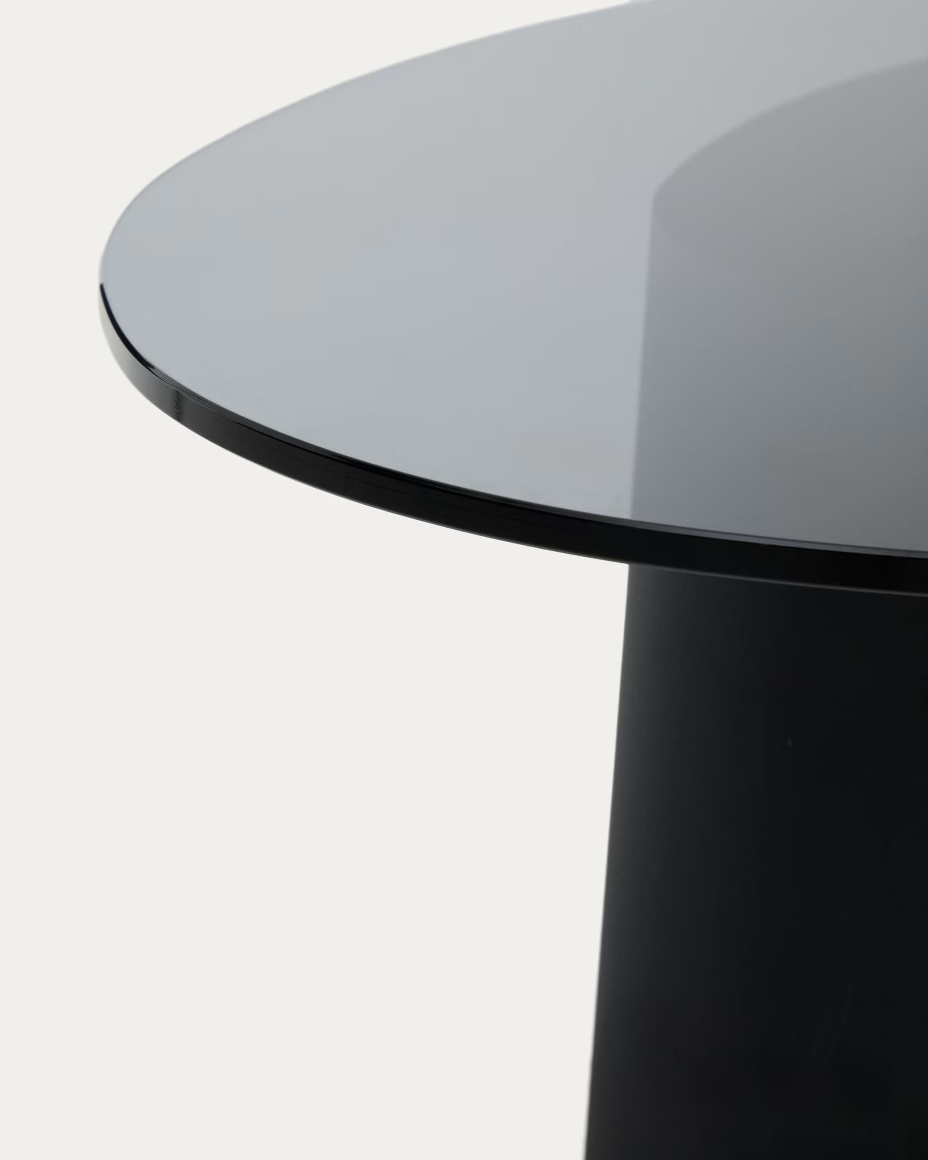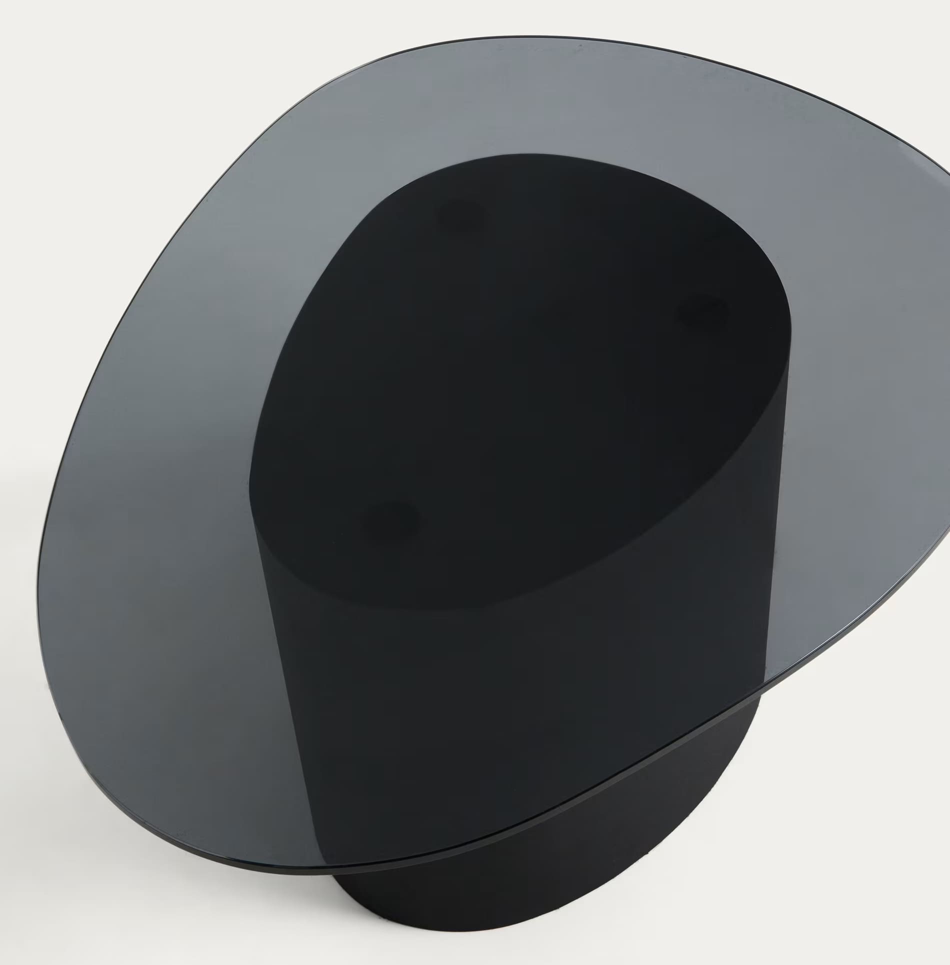 Столик сочетает прочный металлический каркас с защитным покрытием и столешницу из закаленного стекла с легким затемнением. Скульптурная форма основания придает дизайну выразительность, а стекло визуально облегчает пространство и пропускает свет.